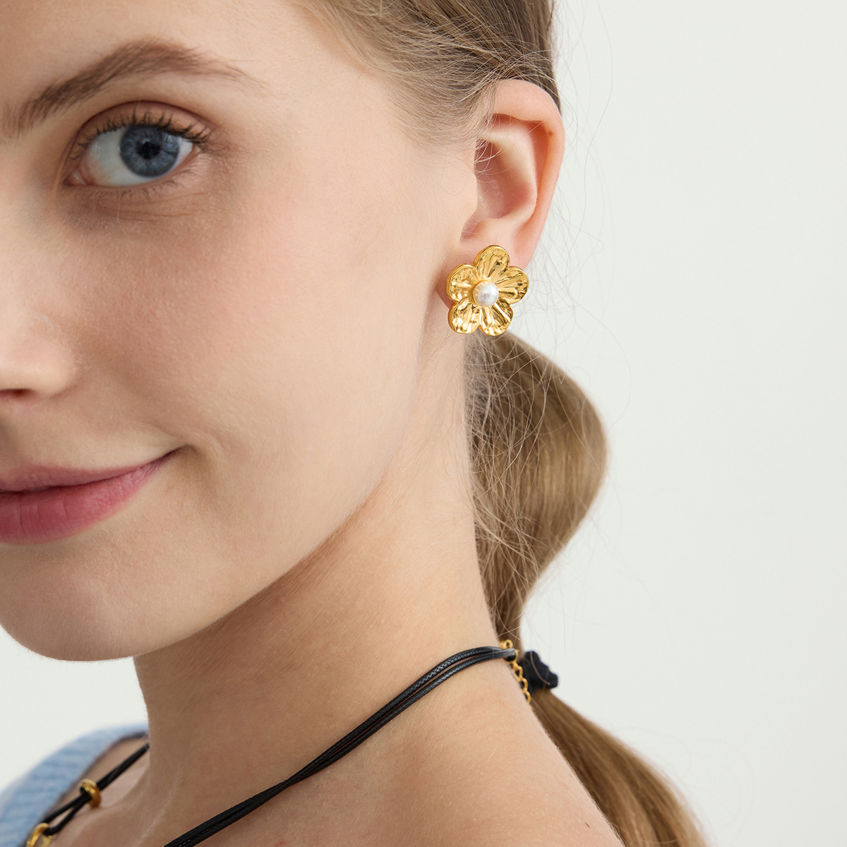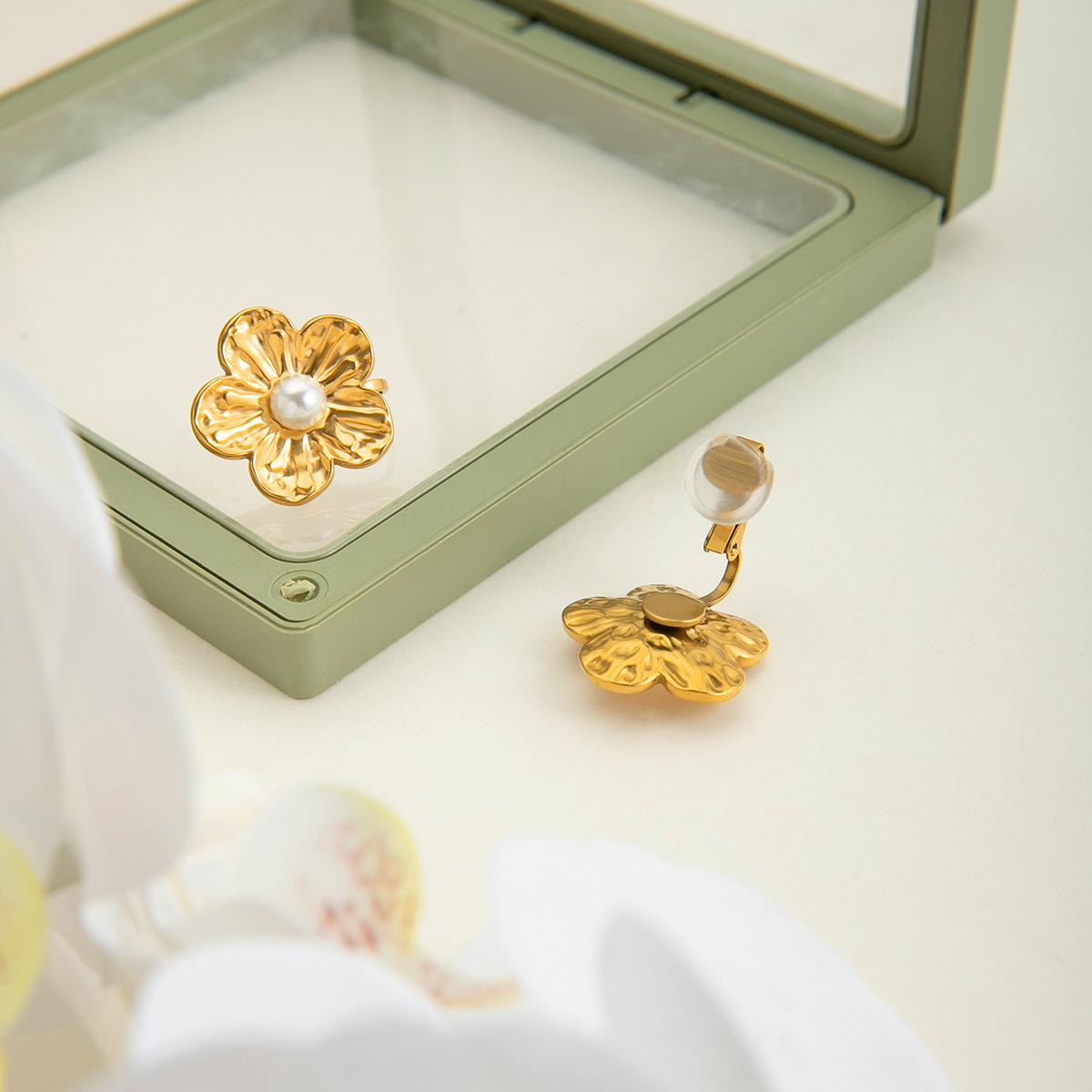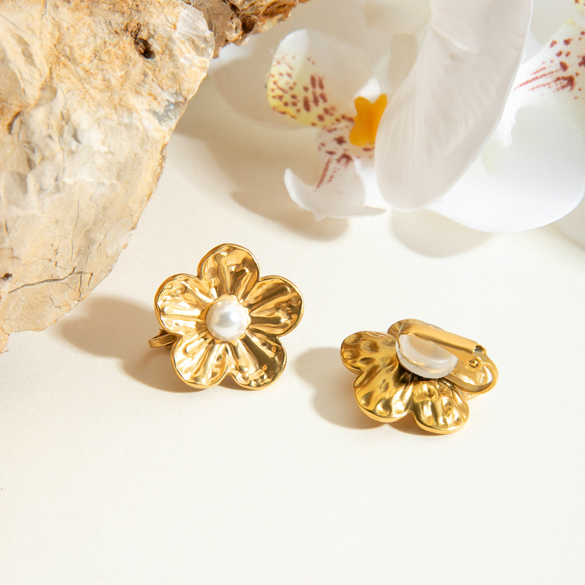 Delicate flower and pearl ear cuffs plated in 18K gold on stainless steel. Clip-on design makes them perfect for anyone without pierced ears. Sweet, vintage-inspired, and lightweight for everyday elegance.