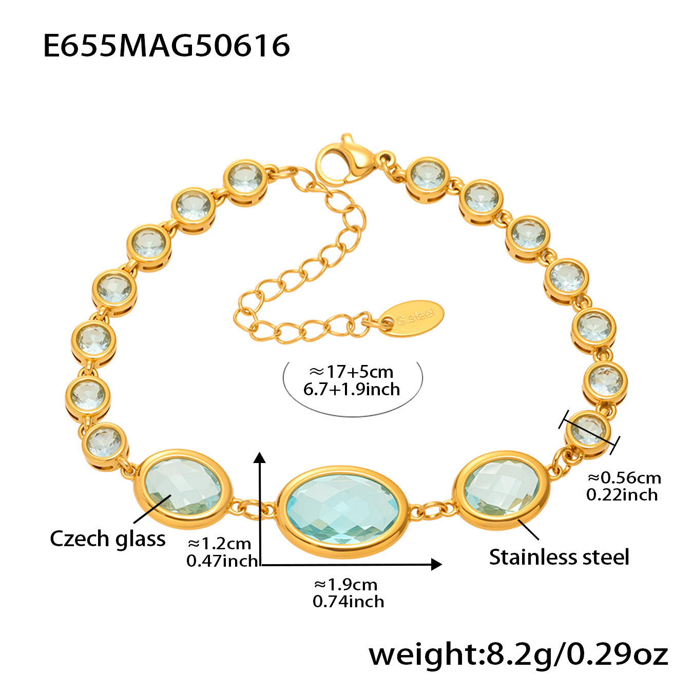 This elegant bracelet features an oval-cut crystal glass, beautifully plated in 18K gold and crafted from durable stainless steel. Designed to maintain its shine, it’s the perfect accessory for adding a touch of luxury to your outfit. A perfect gift for any occasion or a stylish addition to your jewelry collection.