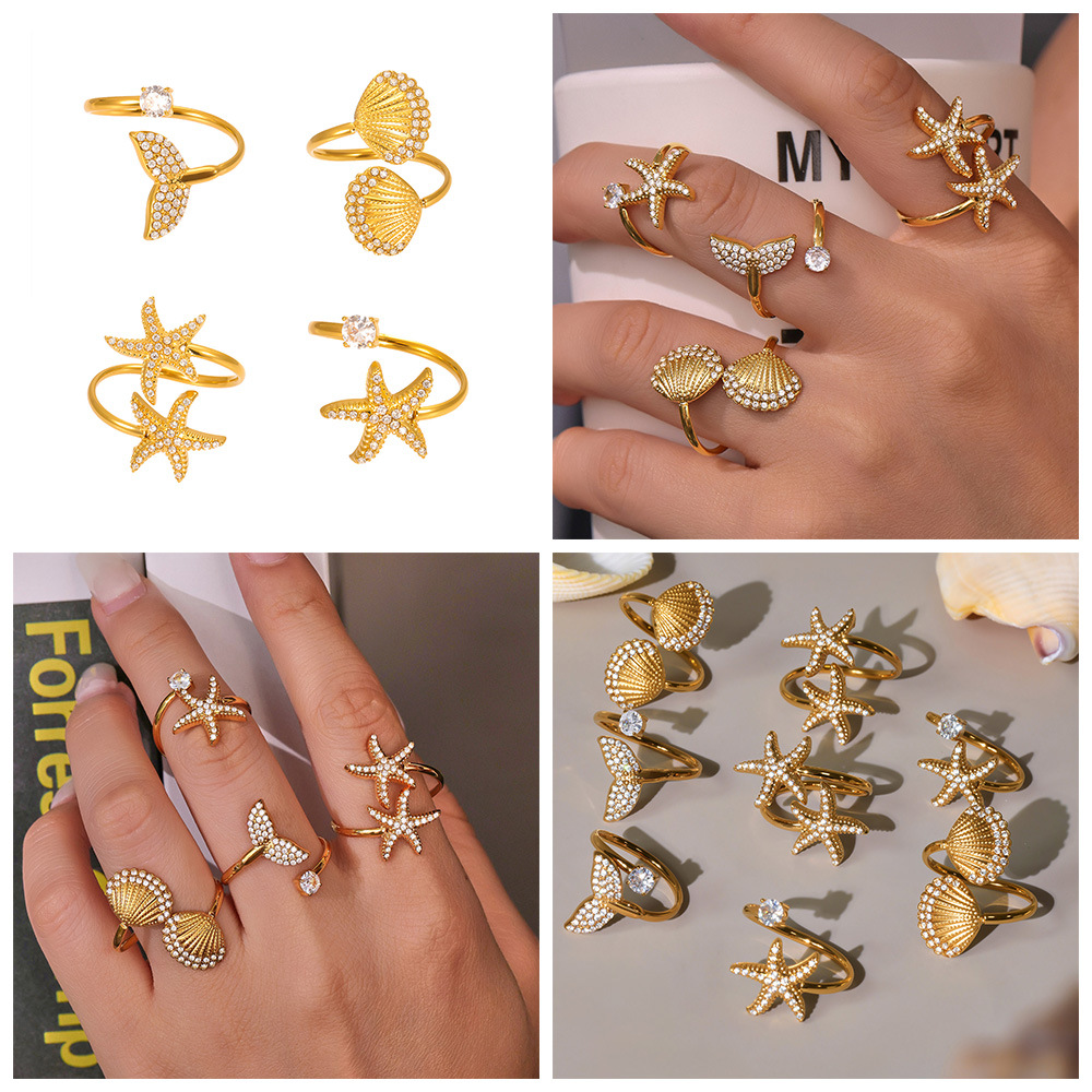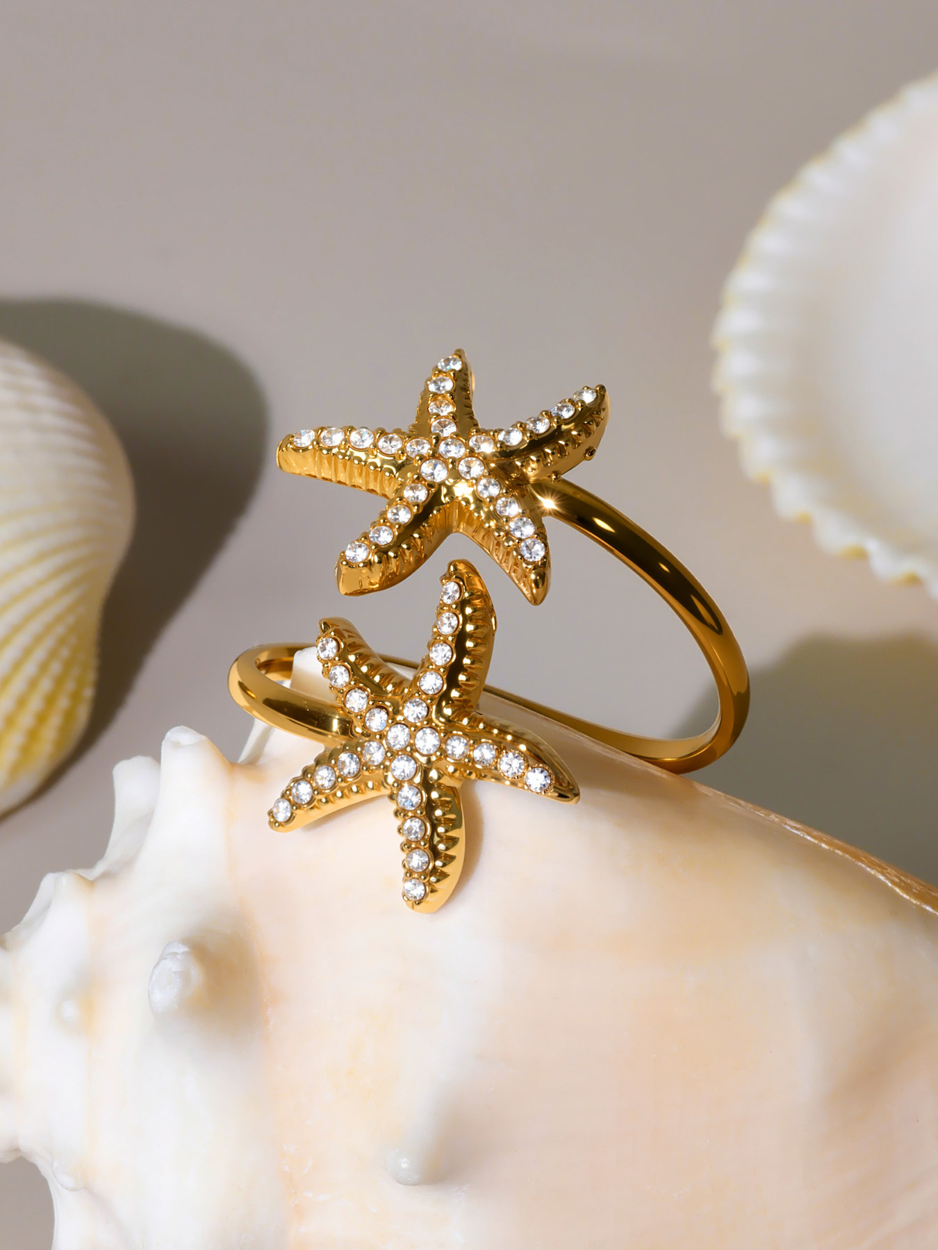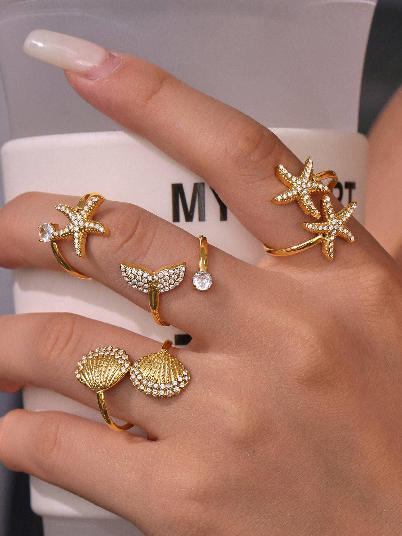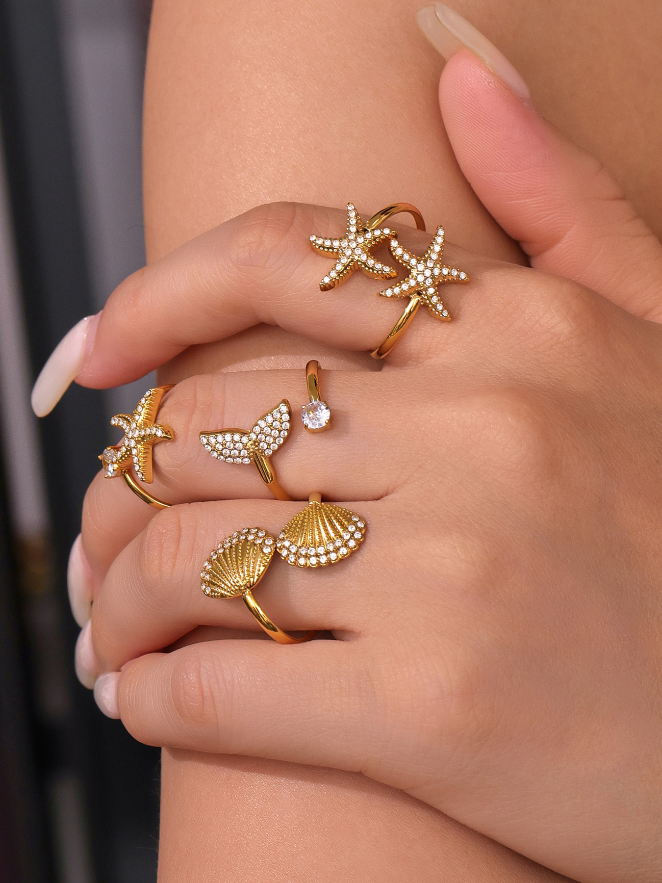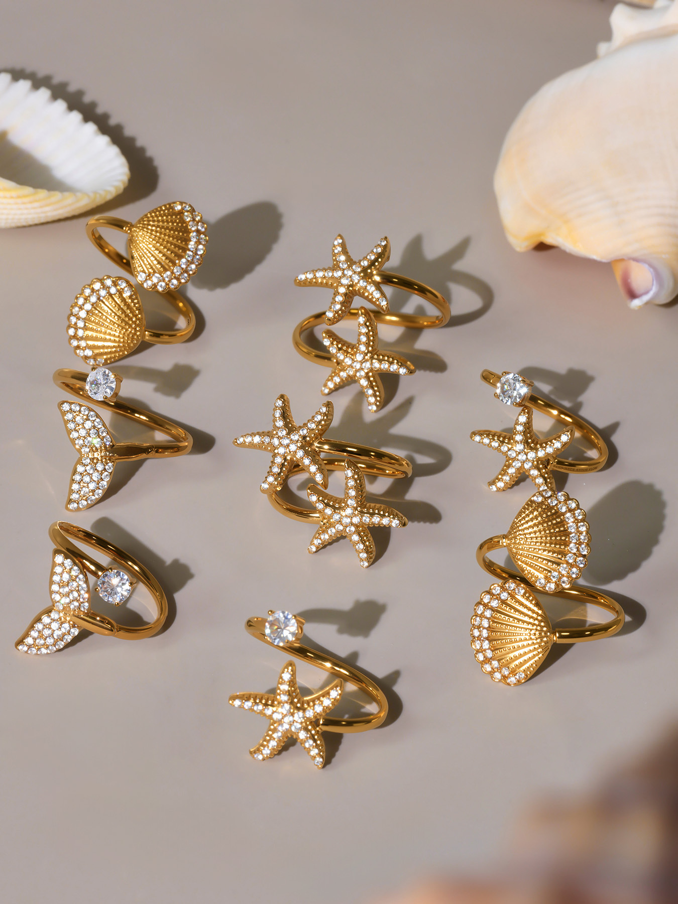 18K Gold Starfish Shell Ring – Adjustable CZ Beach Ring