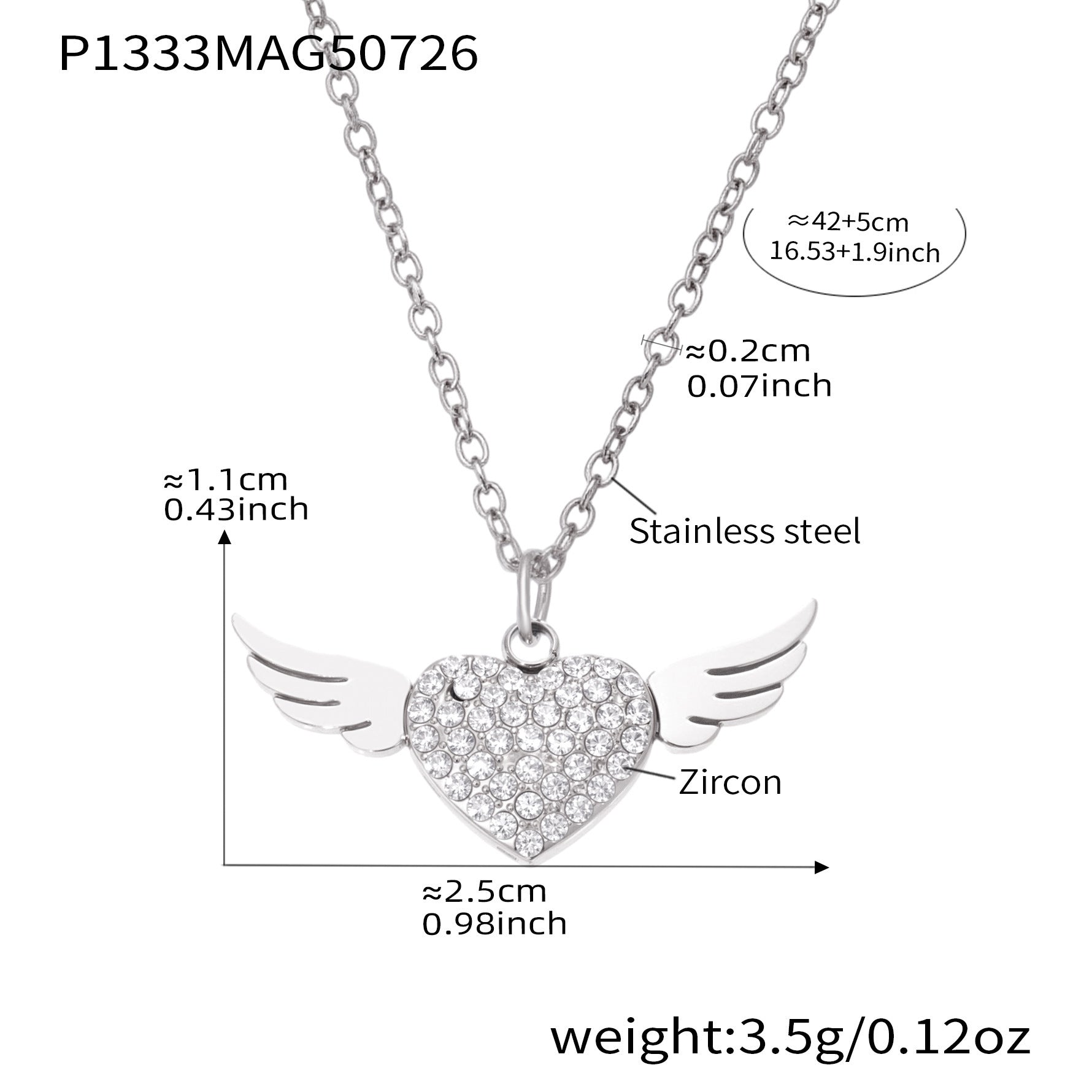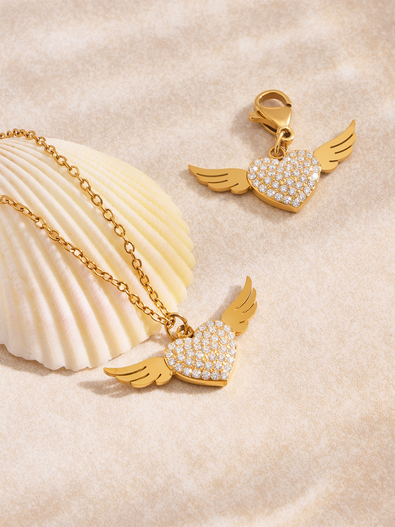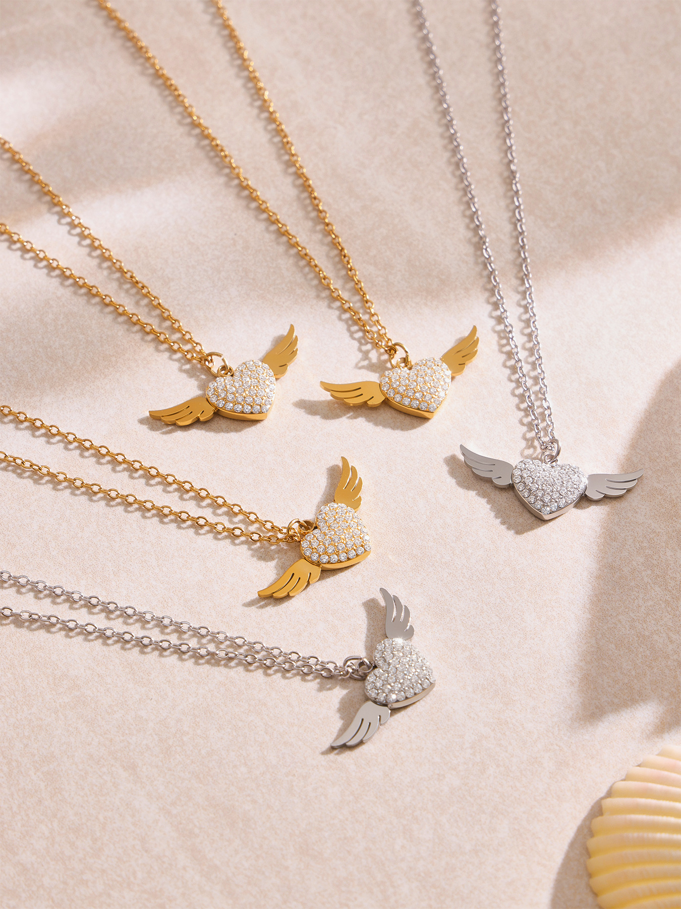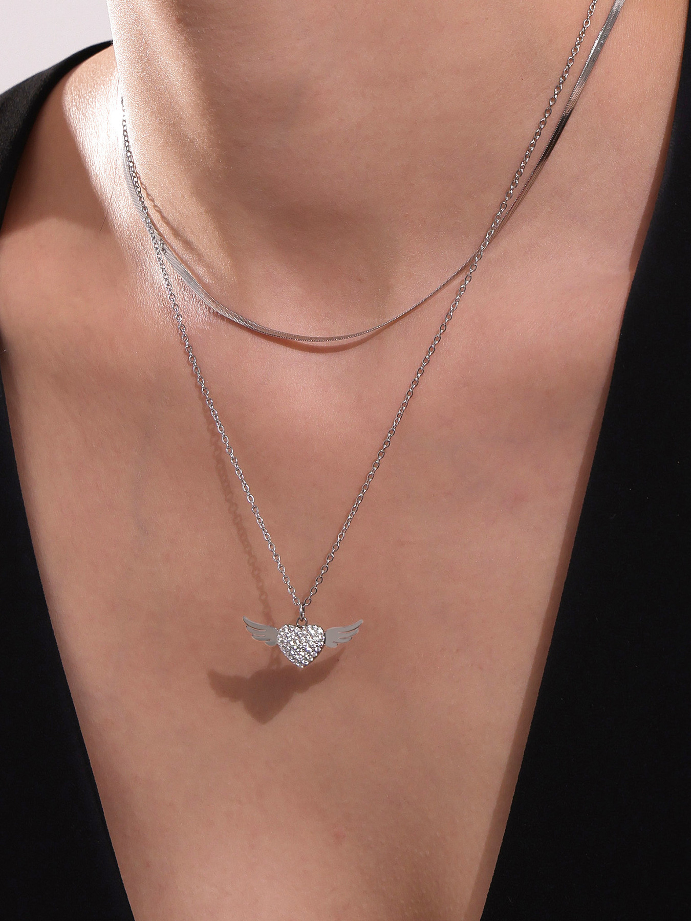 This double-layer necklace features a sparkling heart and wing pendant, paved with zircon stones and plated in 18K gold. Made from durable stainless steel, it’s perfect for adding a delicate, trendy touch to any outfit. Ideal for layering or gifting.