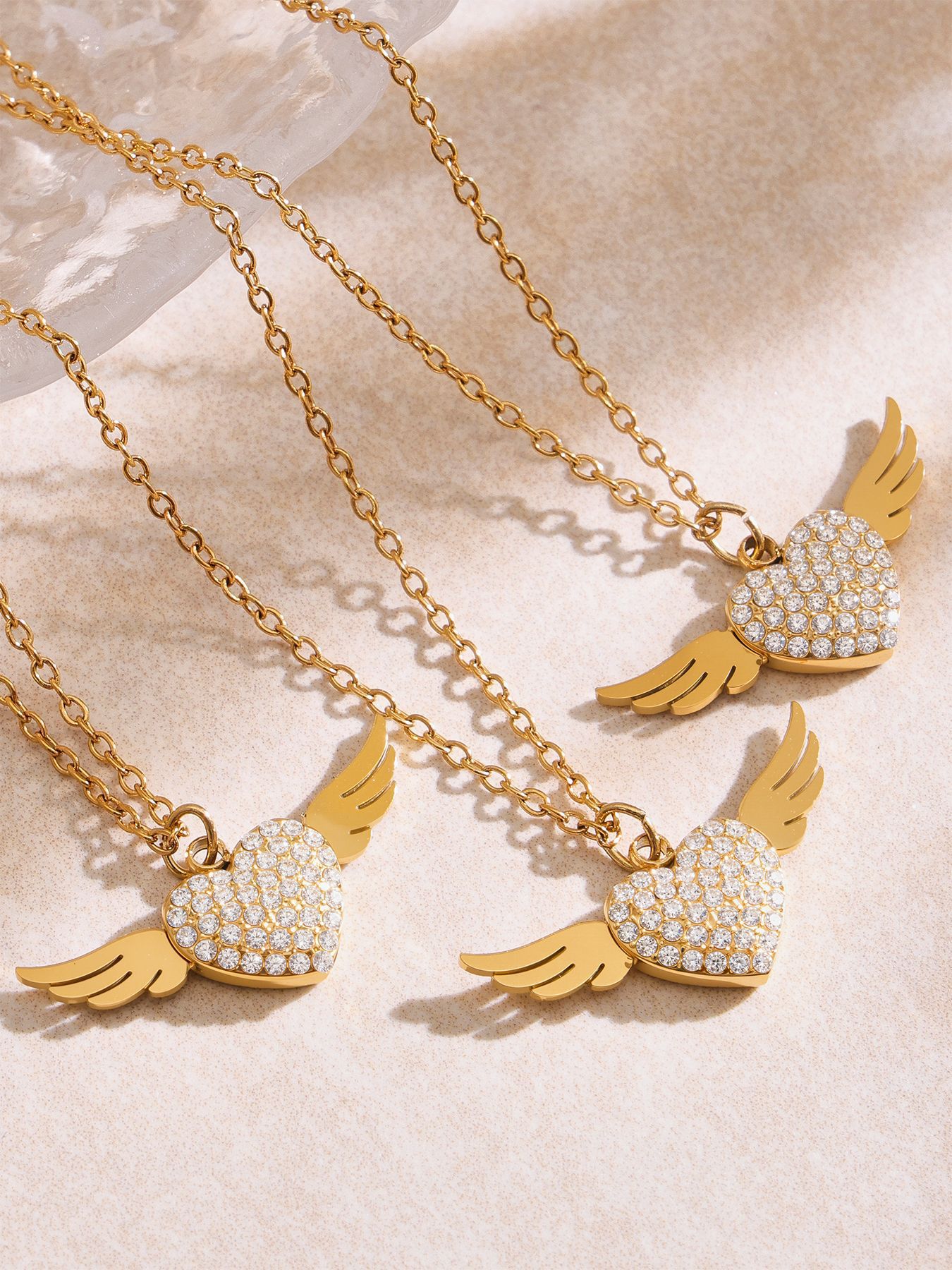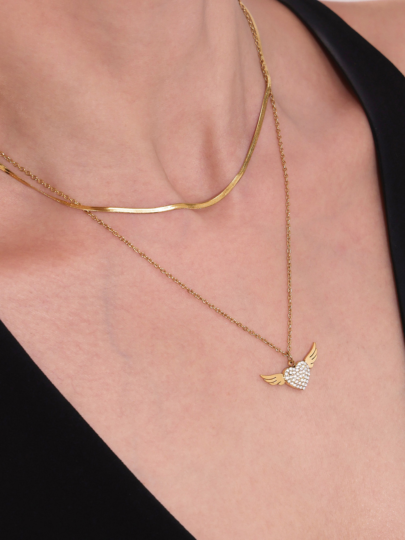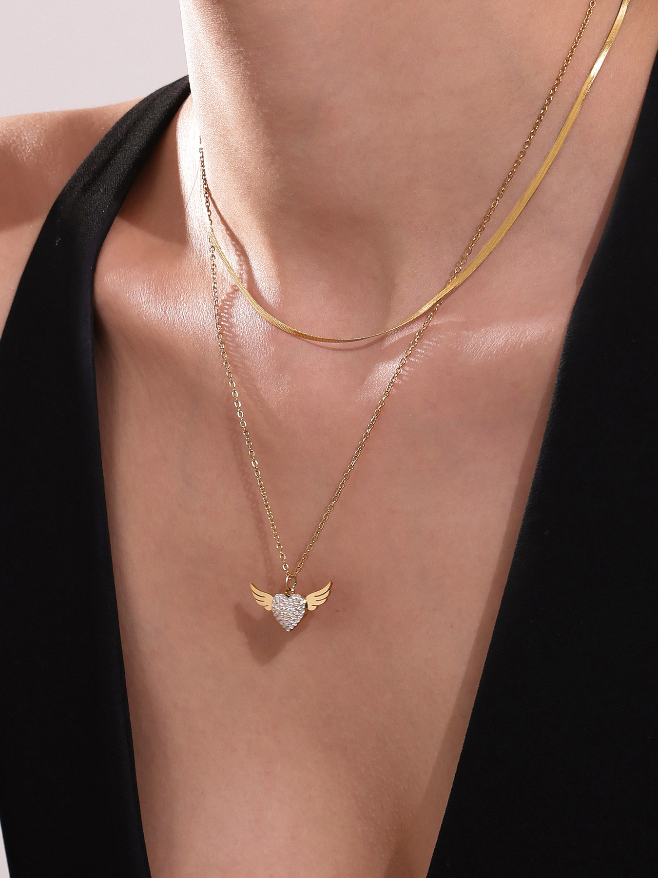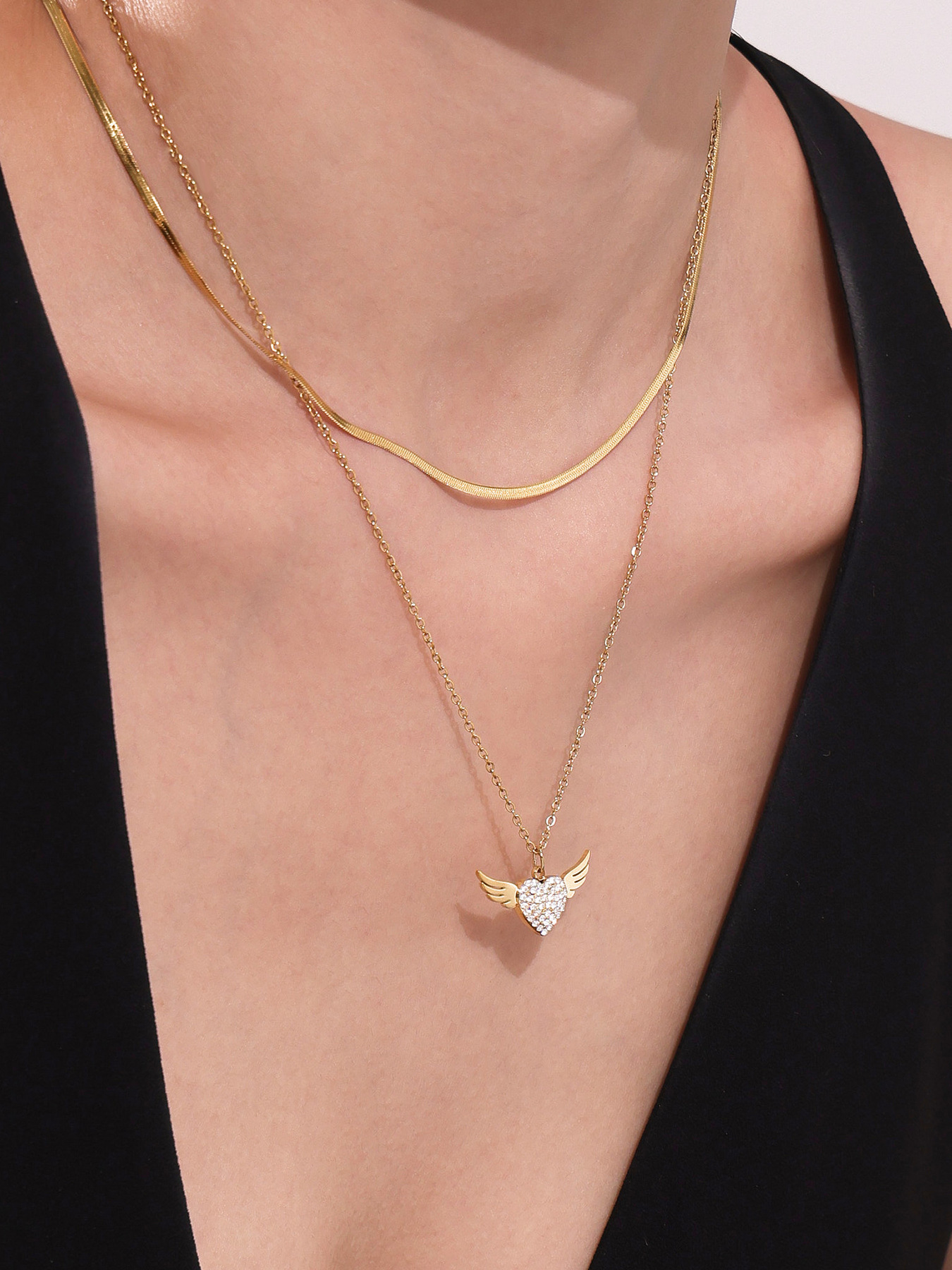 18K Gold Plated Stainless Steel Double-Layer Necklace – Paved Heart & Wing Zircon Pendant