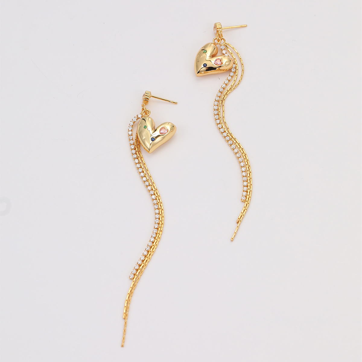 Delicate asymmetric heart earrings with sparkling CZ accents and flowing tassels. Lightweight, stylish, and perfect for adding a subtle, chic touch to any outfit.