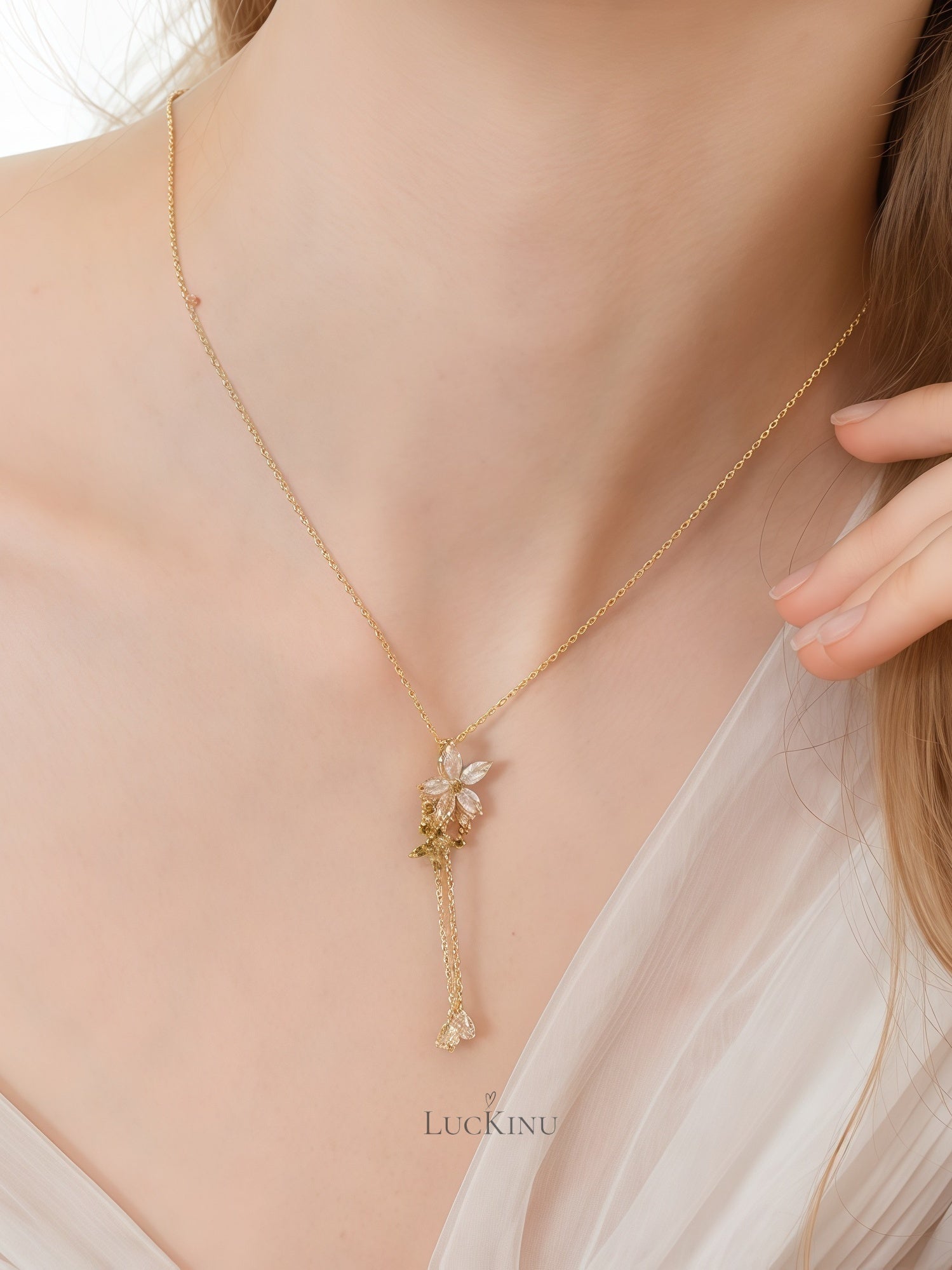 White & Green Floral Necklace – Elegant Collarbone Jewelry