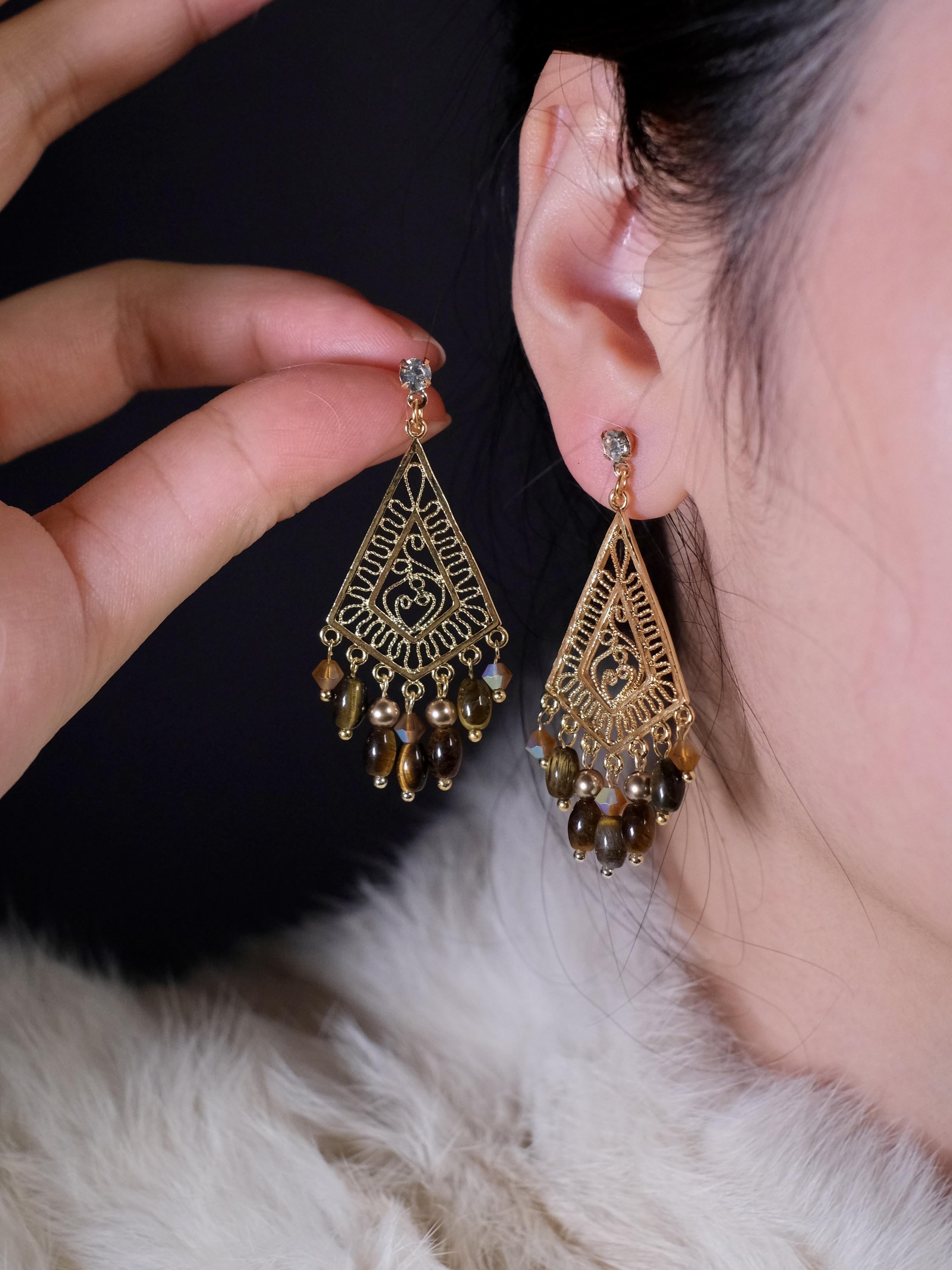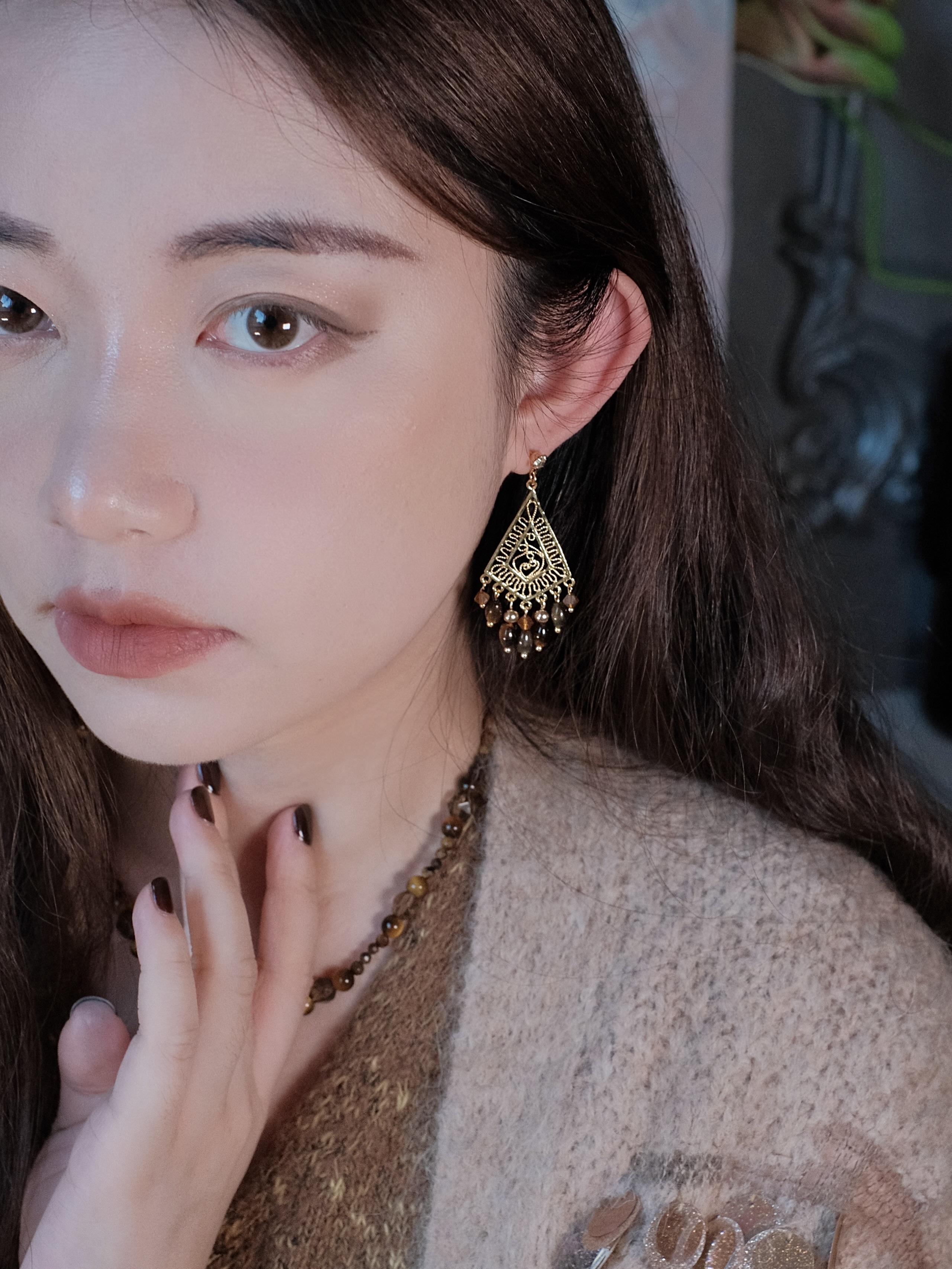 Experience bohemian charm with these vintage-inspired tassel earrings, featuring warm tiger’s eye stones and intricate textural details. Designed in a Gypsy aesthetic that blends autumn and winter vibes, these earrings add a rich, earthy elegance to any outfit.