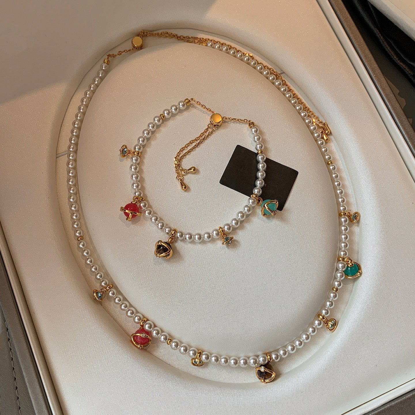 Add a pop of color and elegance with this dopamine-inspired planet pendant necklace. Featuring Swarovski aurora pearls and a playful star design, it’s perfect for layering or wearing solo, bringing a touch of luxury and charm to any outfit.