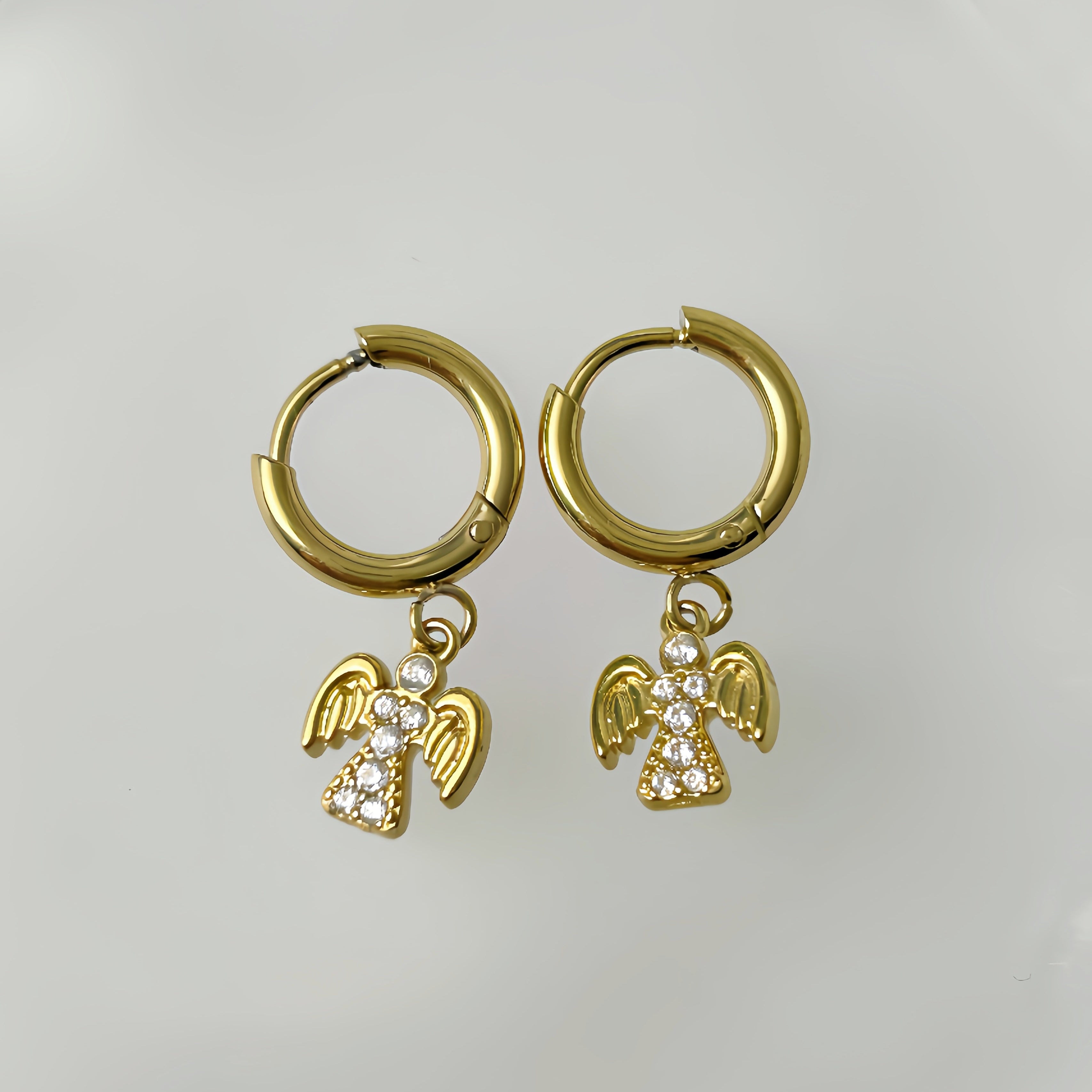 Add a touch of angelic elegance with these dainty angel pendant earrings, featuring a sparkling 5A cubic zirconia that shines beautifully. Crafted from eco-friendly titanium steel, these lightweight hoop earrings are tarnish-resistant, hypoallergenic, and perfect for everyday wear.