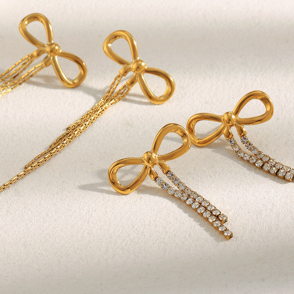Elevate your daily style with these delicate bow tassel earrings. Crafted from high-quality stainless steel and plated in 18K gold, they feature sparkling zircon stones and fine tassel details. Waterproof, tarnish-free, and versatile, these earrings are perfect for everyday wear or layering with other minimalist jewelry for a subtle, chic statement.