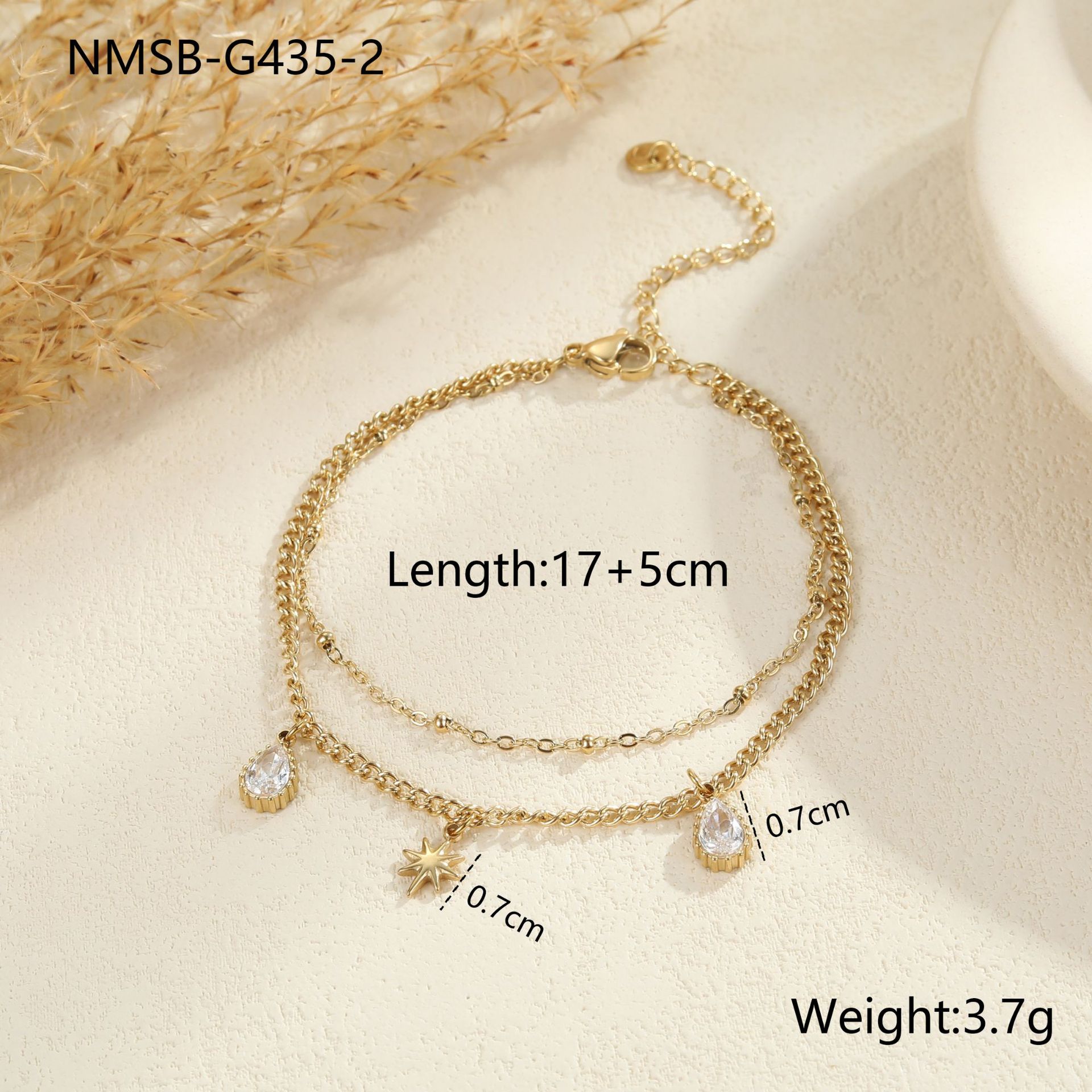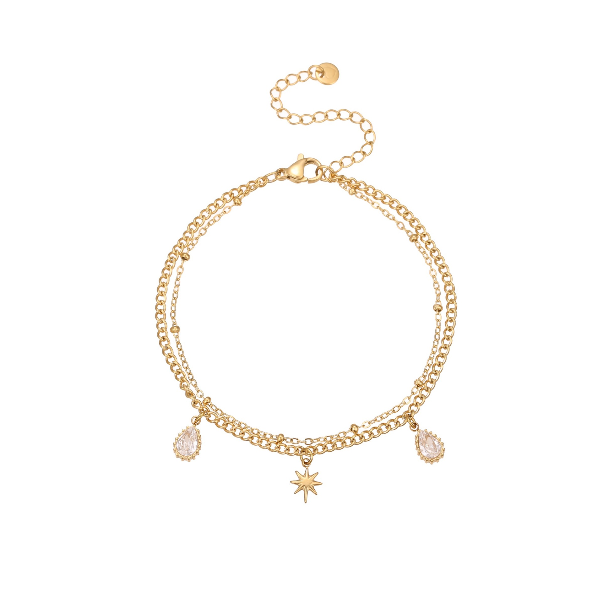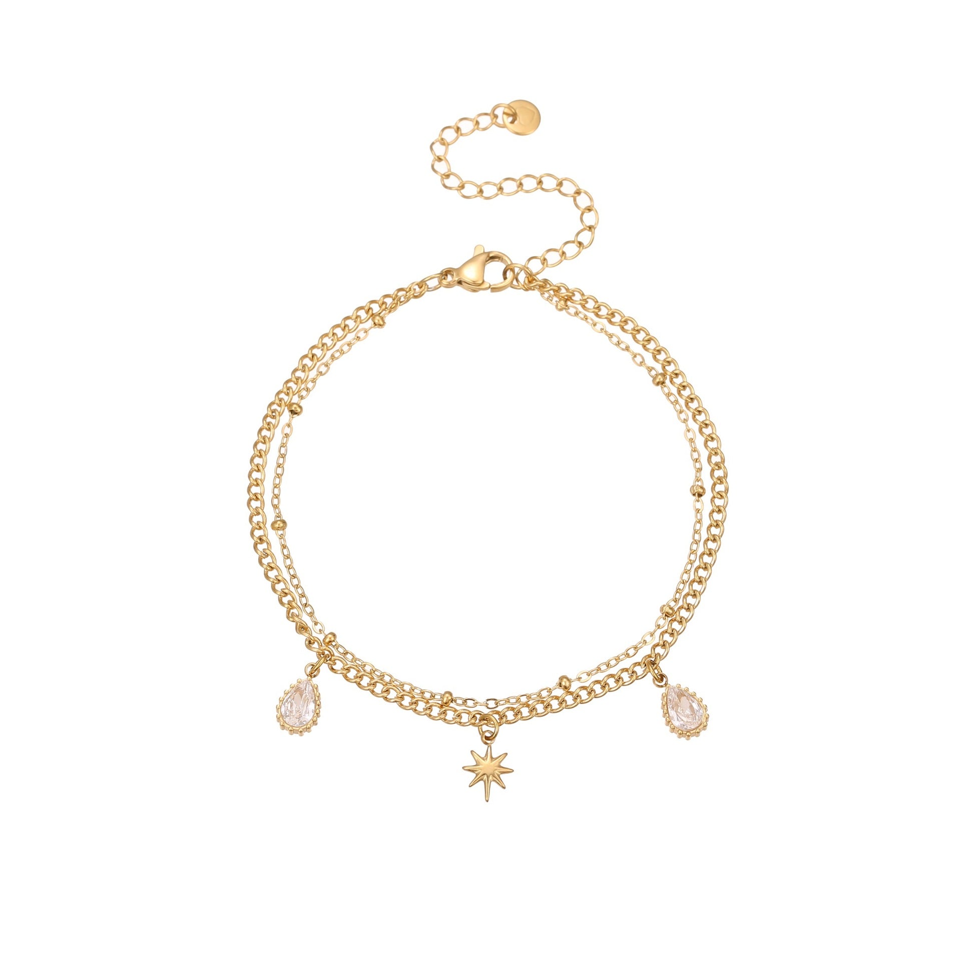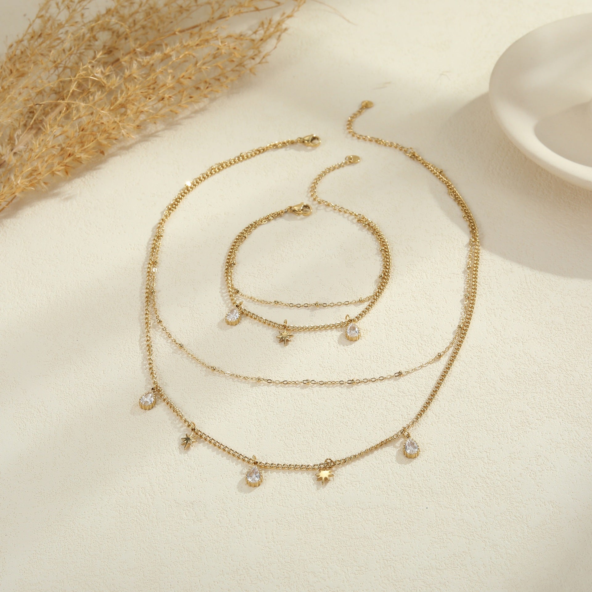 A double-layer necklace and bracelet set featuring starburst charms with sparkling cubic zirconia, crafted from stainless steel. Sleek, lightweight, and perfect for layering or adding a subtle, stylish touch to any outfit.
