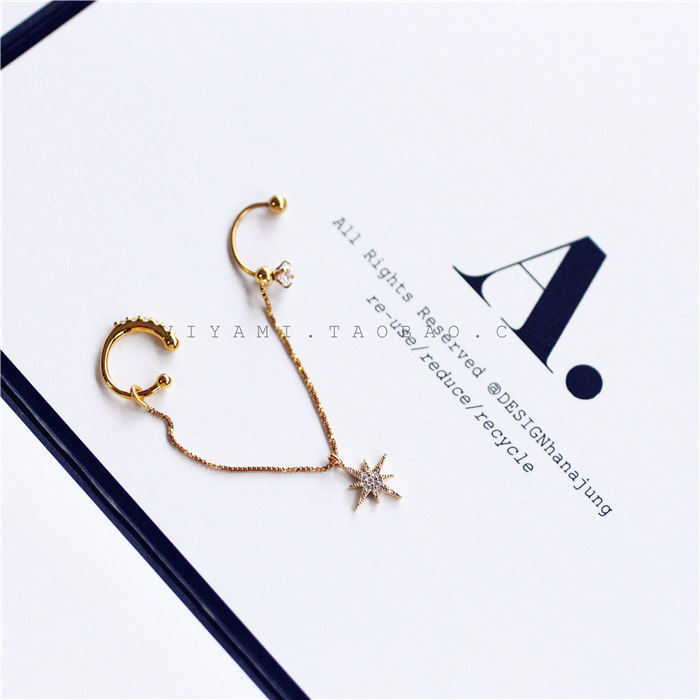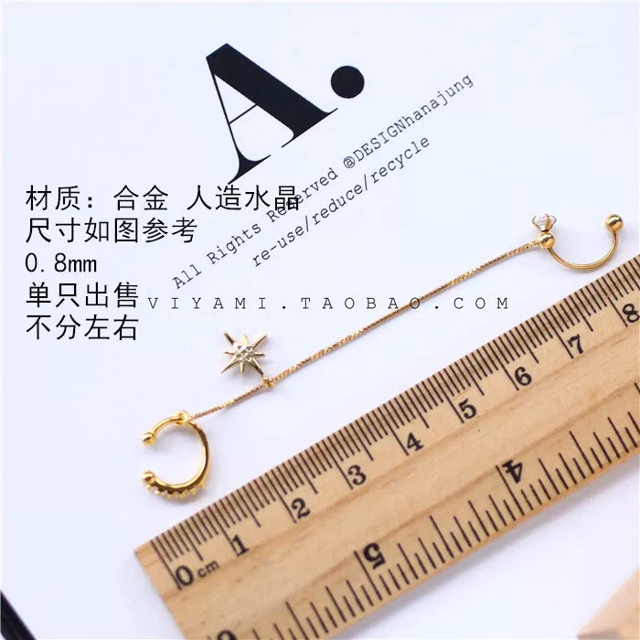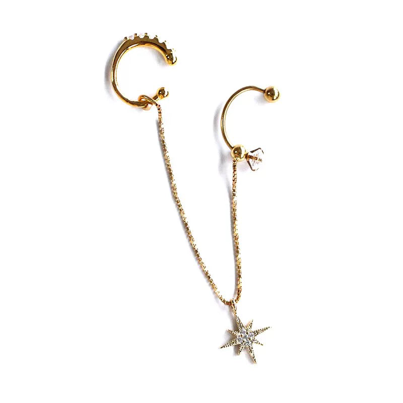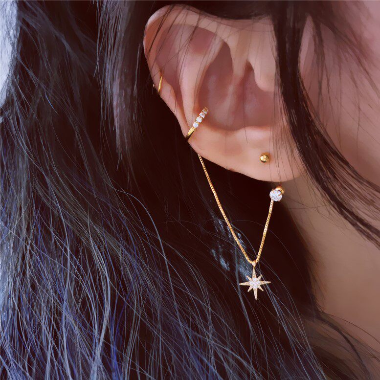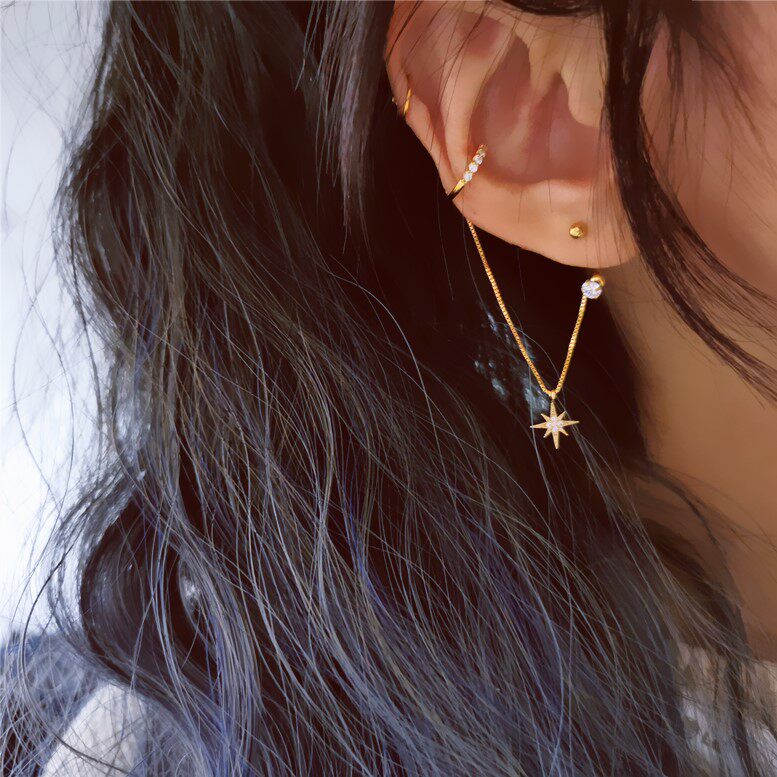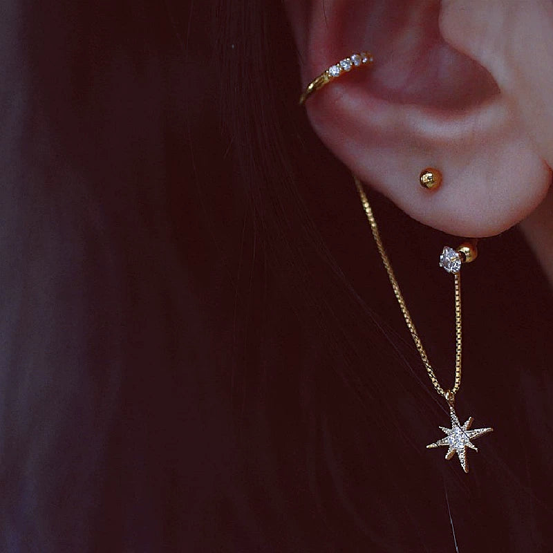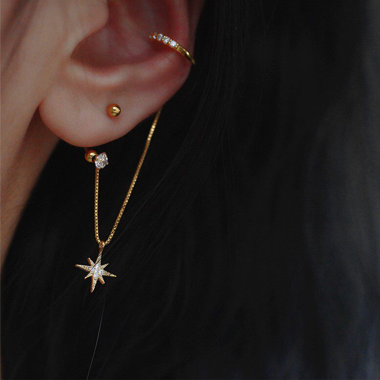 Sterling Silver Eight Point Star Chain Cartilage Earring, Dainty Celestial Screw Back Jewelry