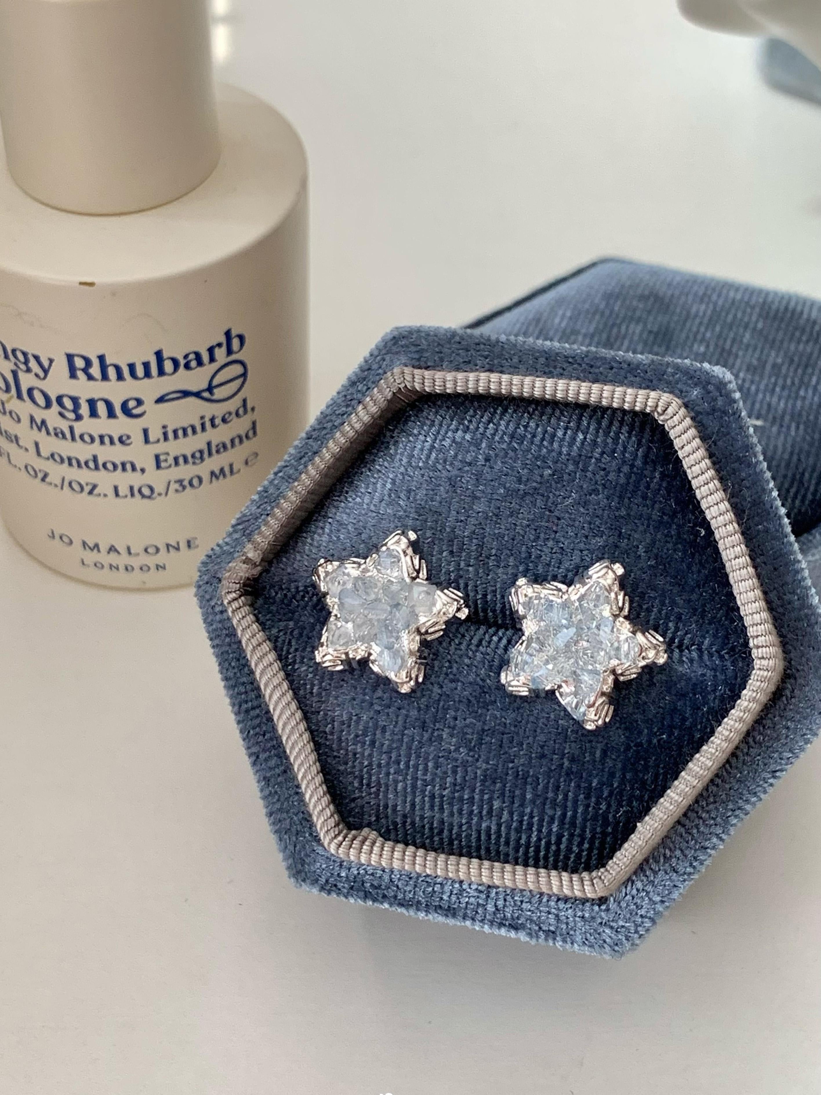 Like two tiny, frozen stars, captured just for you. The Eira is a magical little stud, featuring a cluster of crushed, ice-blue crystals that glitter with a unique, sugar-like sparkle.