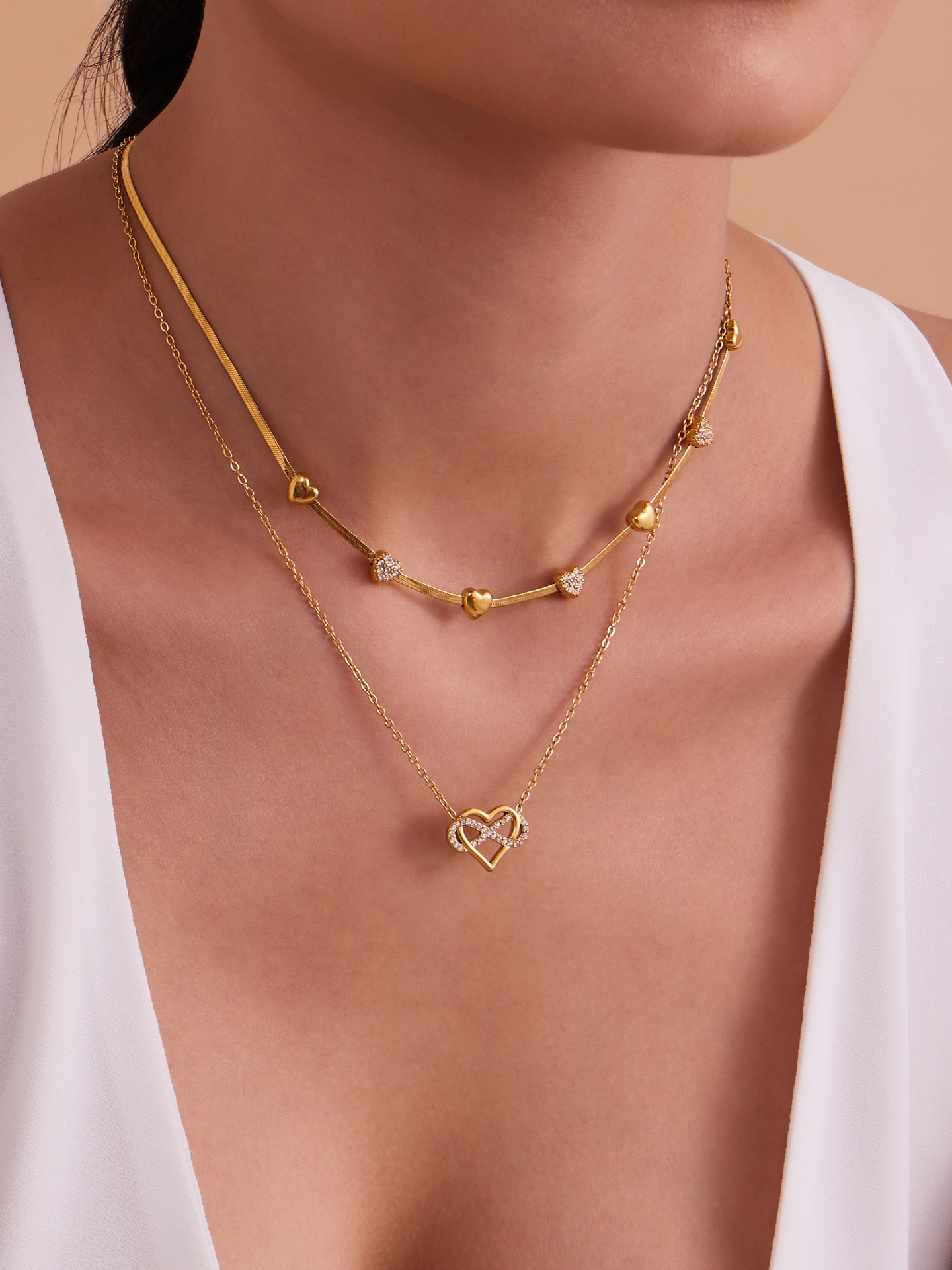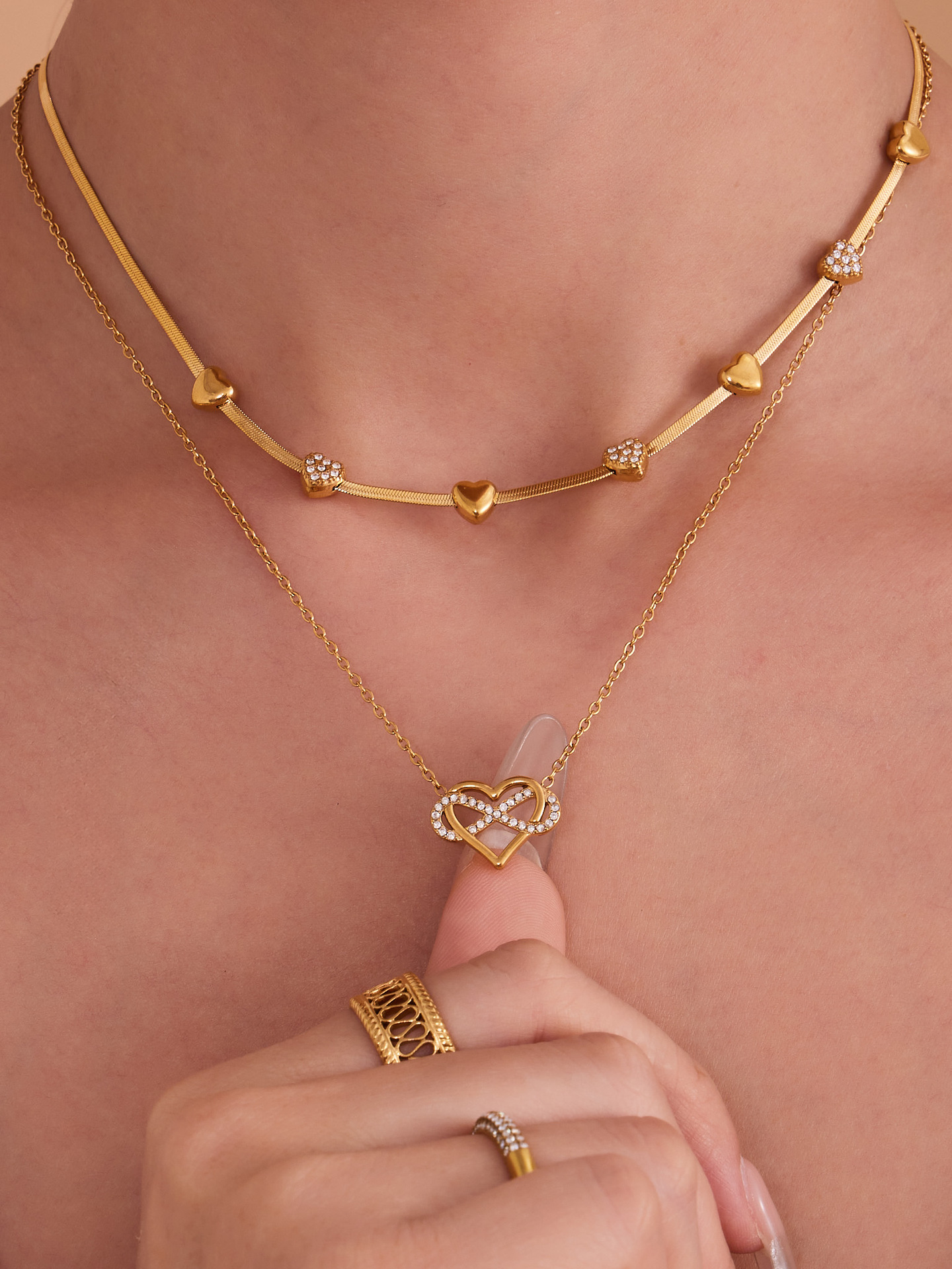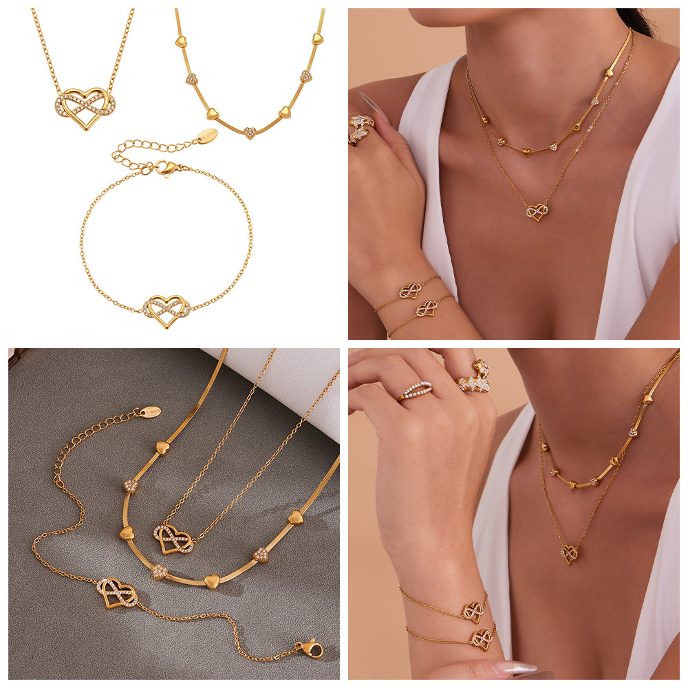 This ultra-delicate infinity heart jewelry set is designed for effortless shimmer and everyday luxury. Featuring a sleek pavé heart charm and micro-fine chains, each piece is crafted from high-quality stainless steel with PVD gold plating for long-lasting color and shine.