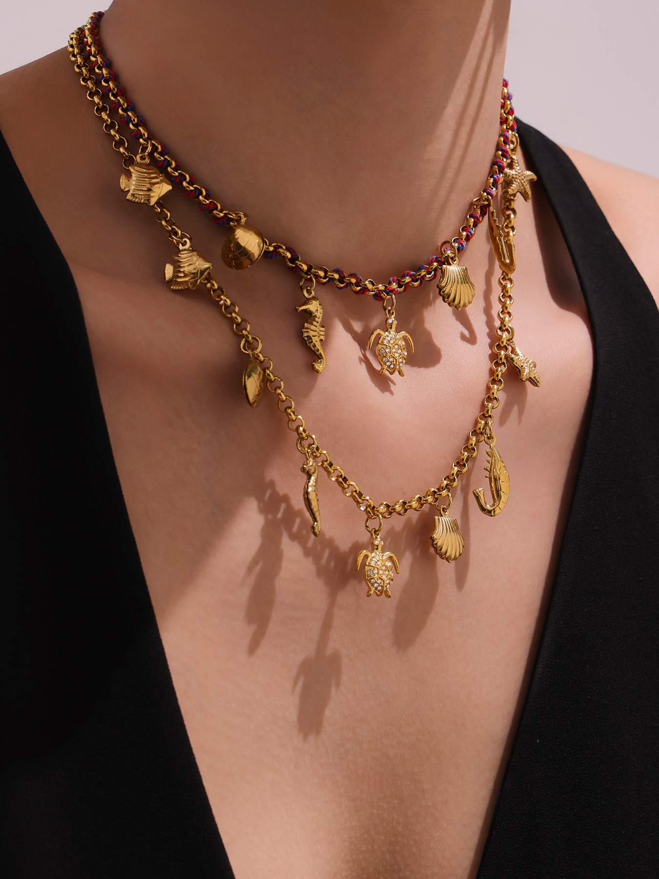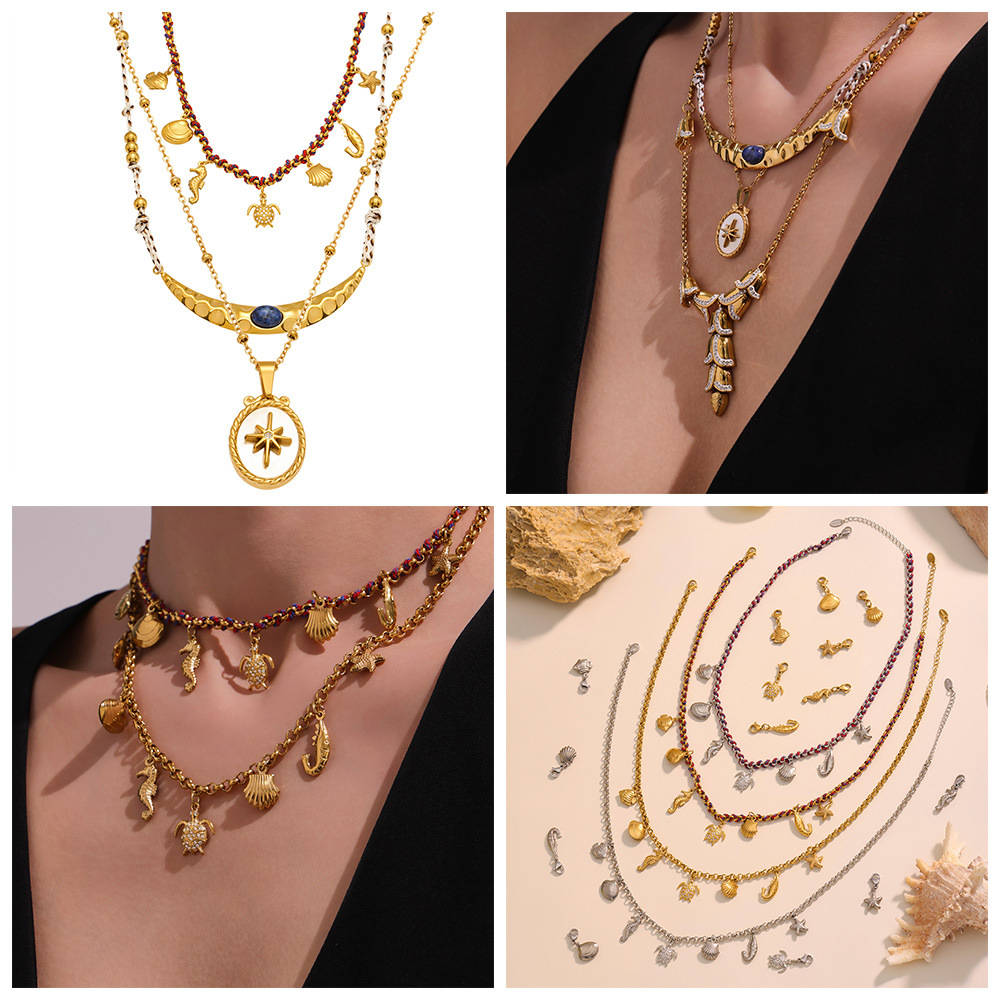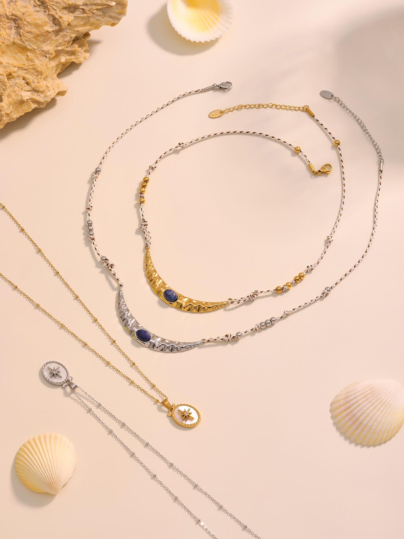 Bring a touch of ocean magic to your look with this kyanite moon necklace paired with a charming sea-turtle and shell pendant. Crafted from durable stainless steel and plated in 18K gold, it blends dreamy blue tones with a beachy, vacation-ready vibe.