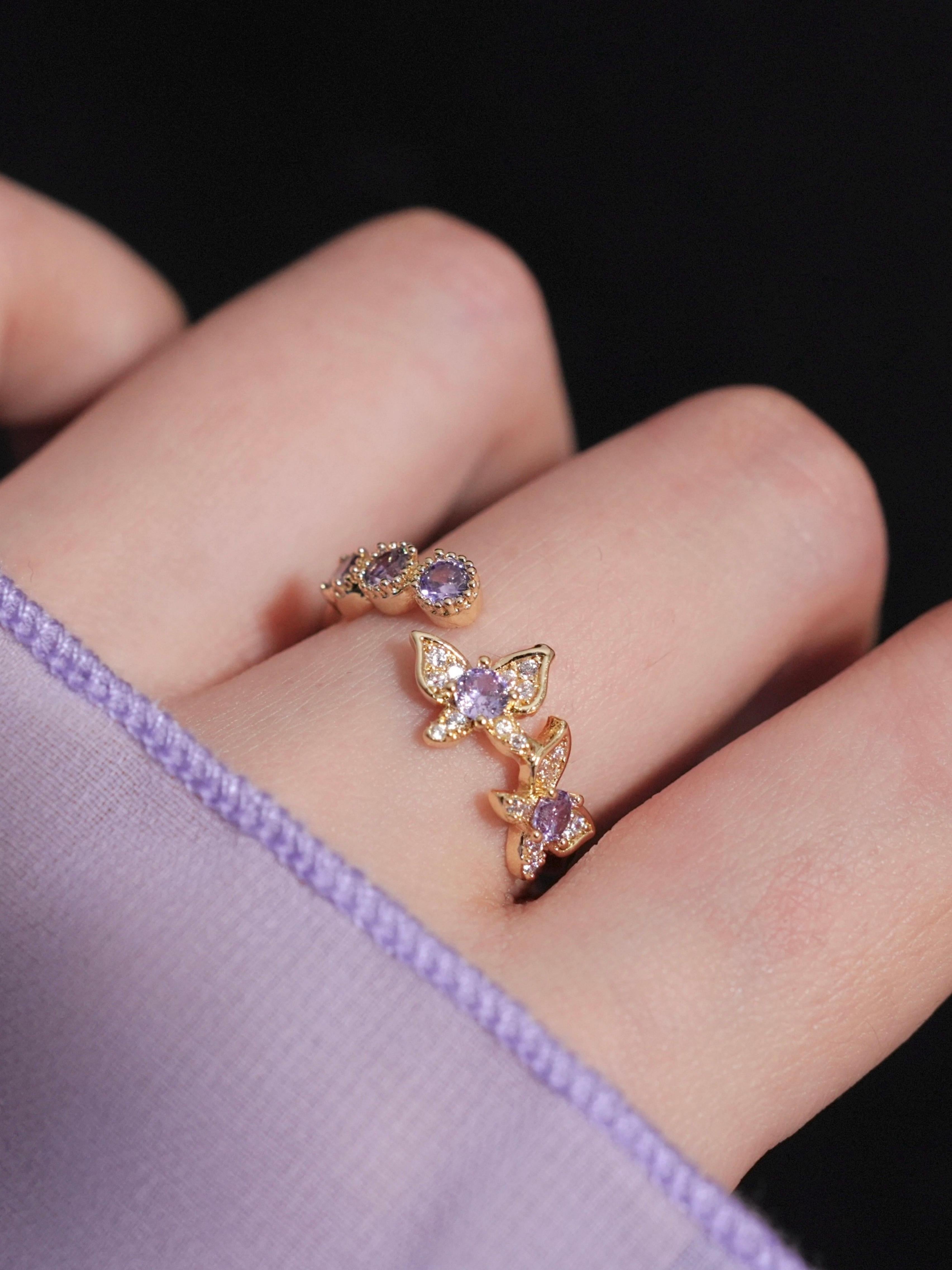Each piece glows in stunning hues of soft lavender and deep amethyst, set in warm, polished gold. Here you'll find delicate butterflies in mid-flight, sparkling celestial stars, and timeless floral blooms, all accented with brilliant crystals that catch the light like captured magic.