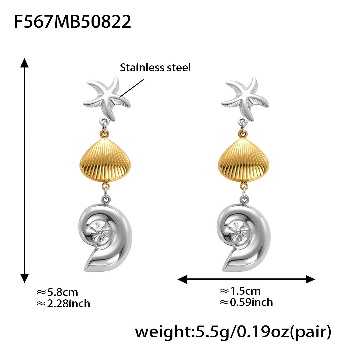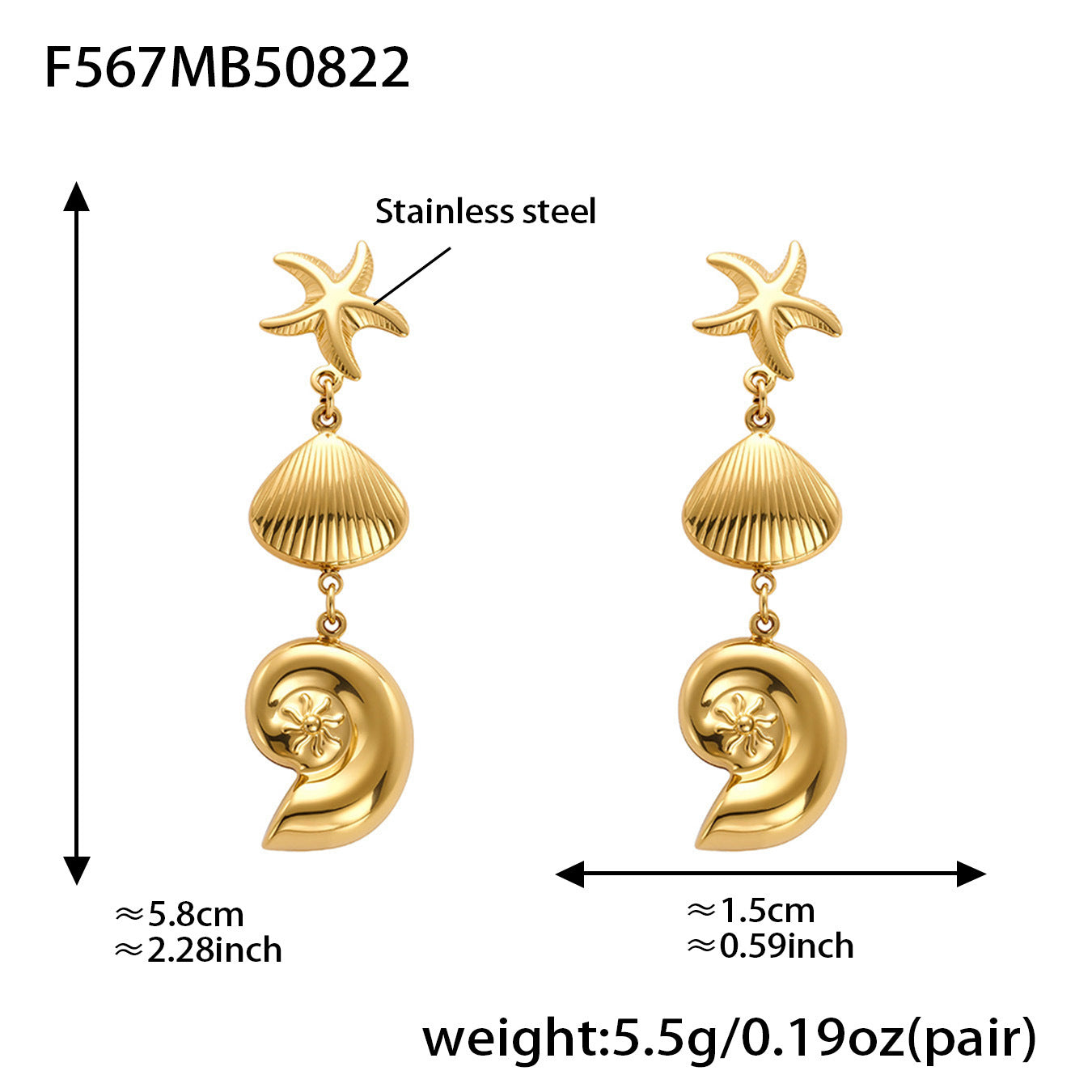 Bring seaside charm to your look with these bold ocean-inspired statement earrings. Featuring a striking combination of a sea shell and starfish, each piece is crafted from durable stainless steel and finished with PVD 18K gold plating for long-lasting shine and color protection.