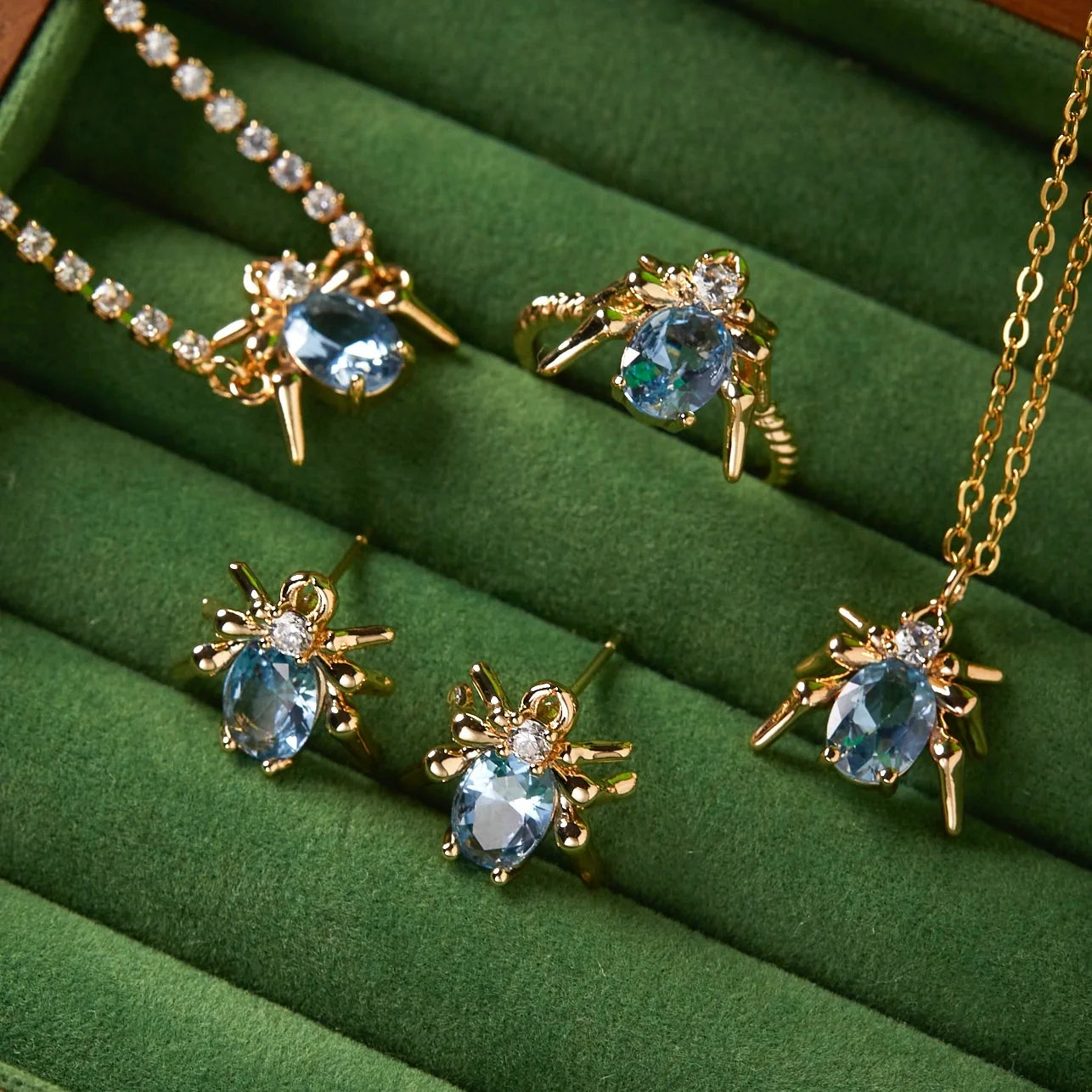 Dare to be different with the “Blue Rose Never Sleeps” collection, a blend of dark romance and bold elegance. Featuring blue spider motifs with shimmering crystals, this series includes dainty stud earrings, edgy ear cuffs, and an adjustable statement ring. Designed for those who love unique, gothic-inspired jewelry with a touch of mystery, each piece captures a fearless spirit and unforgettable charm. Perfect for adding a non-mainstream sparkle to your everyday or night-out look.