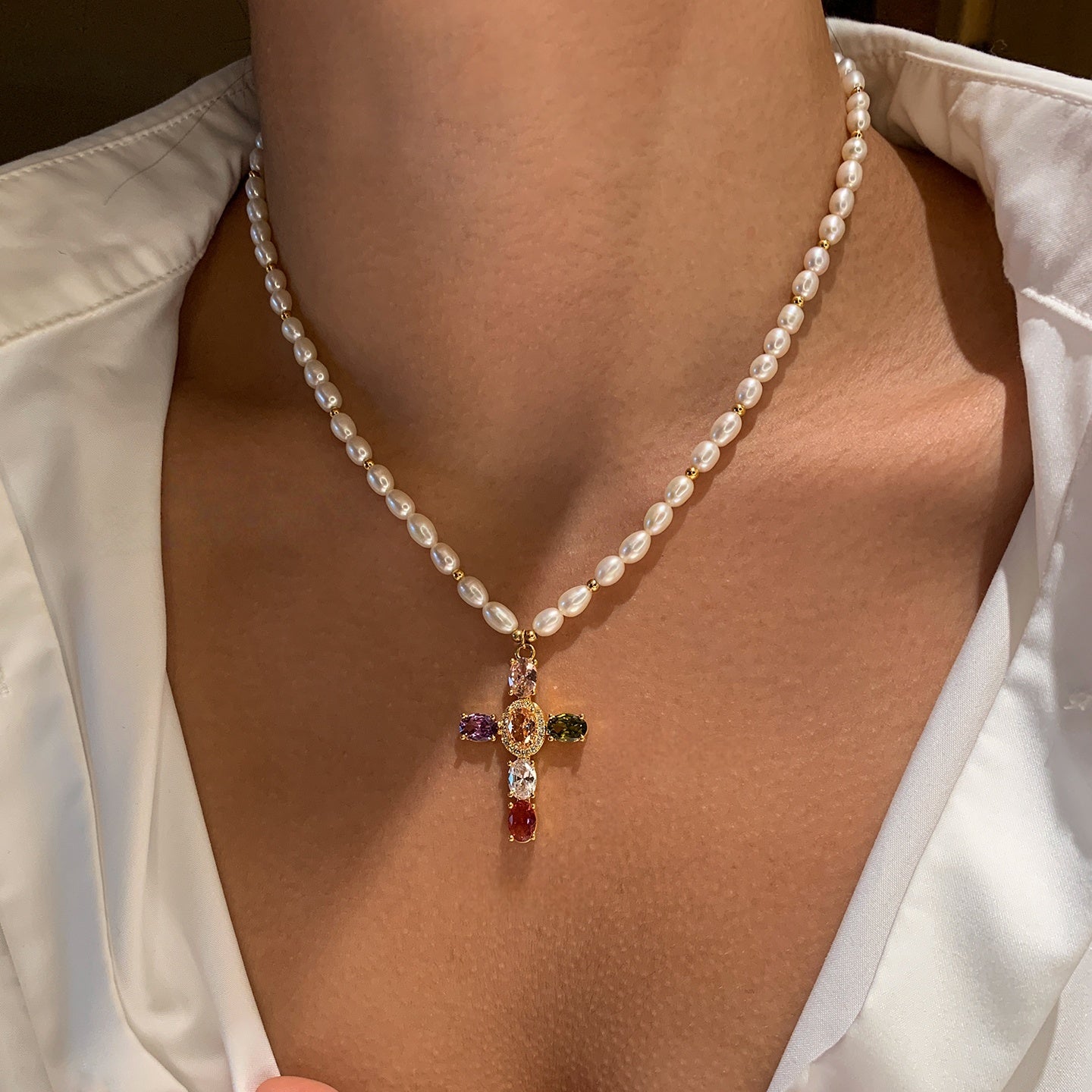 Elegant and unique, this pearl and colorful zircon cross pendant necklace is plated in 22K gold for a radiant finish. A meaningful statement piece, perfect for layering or gifting.