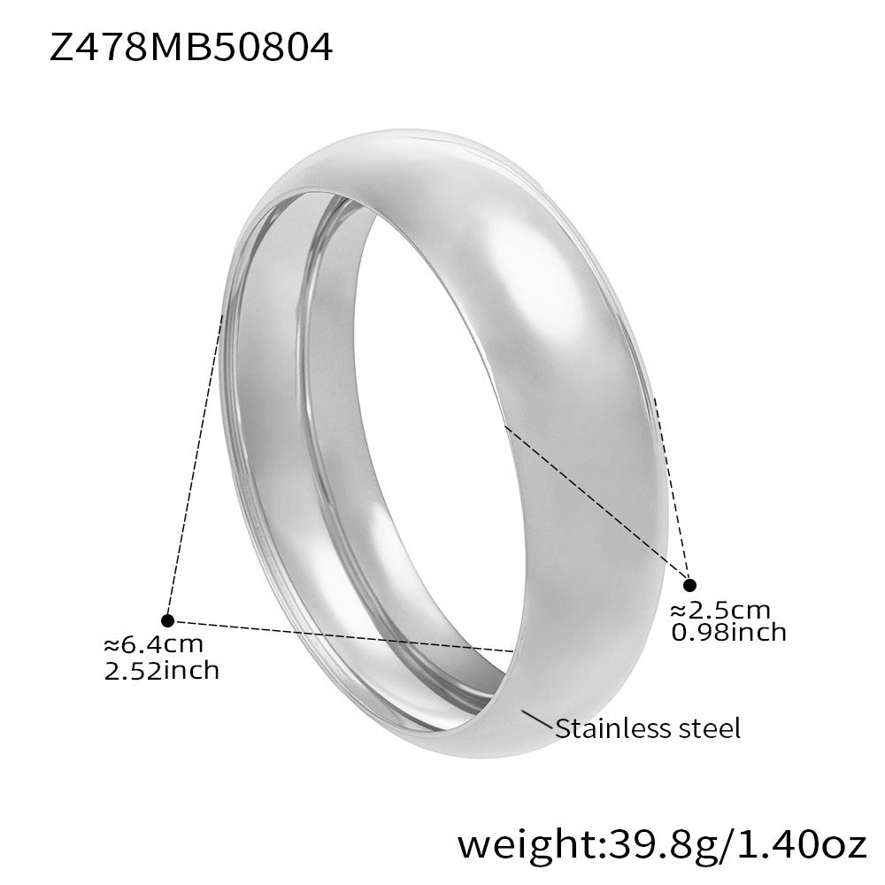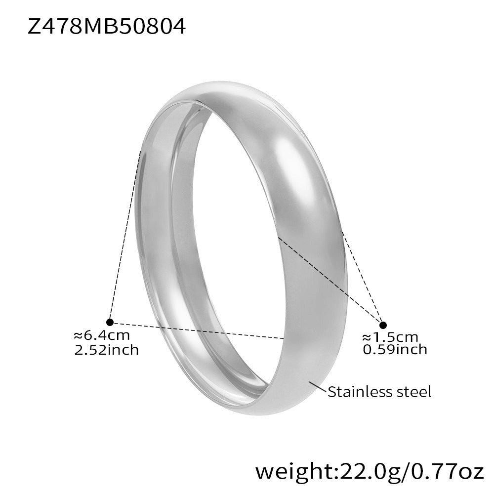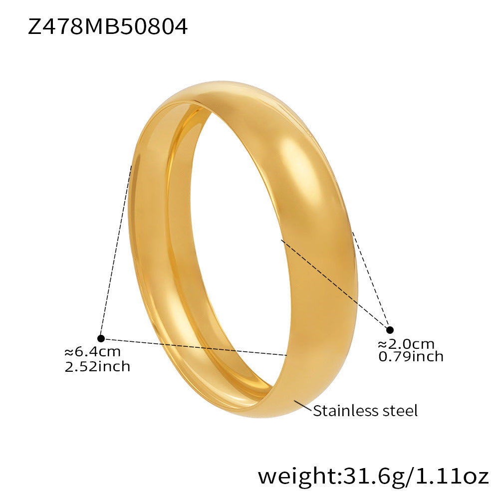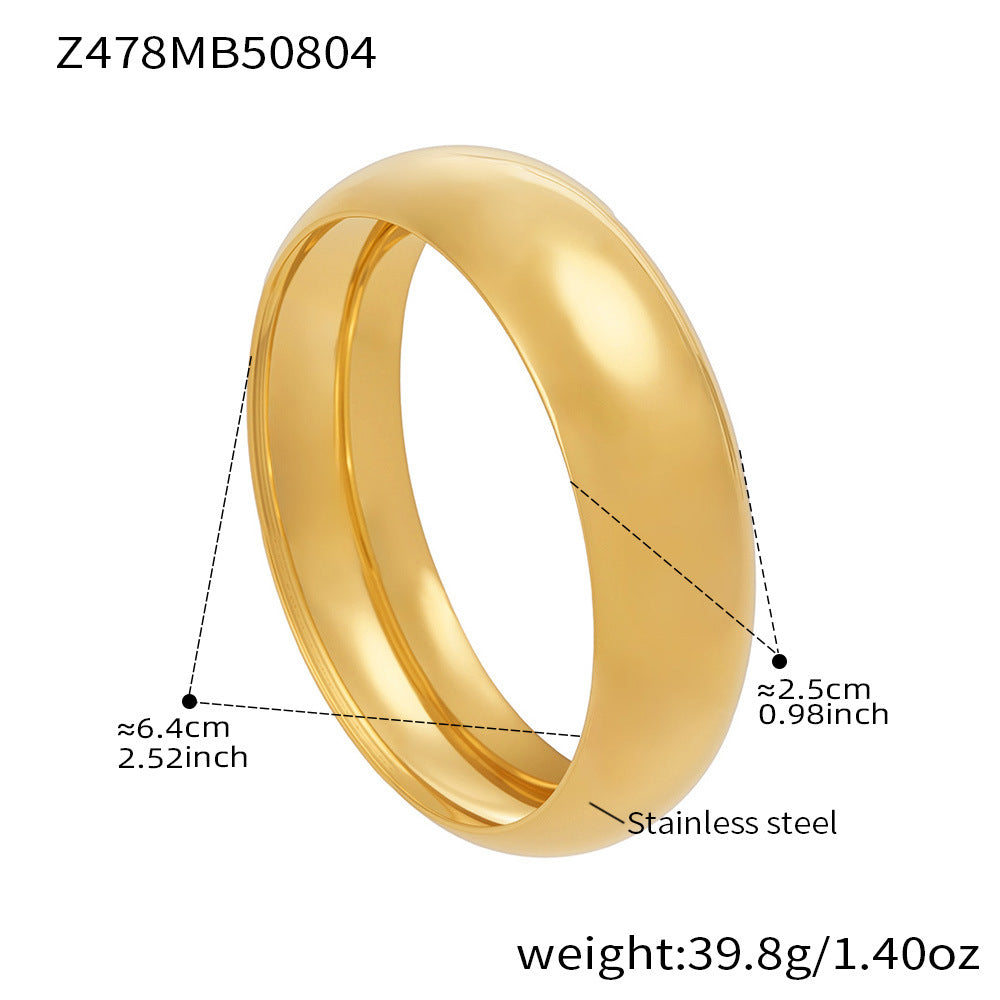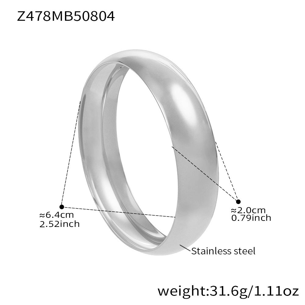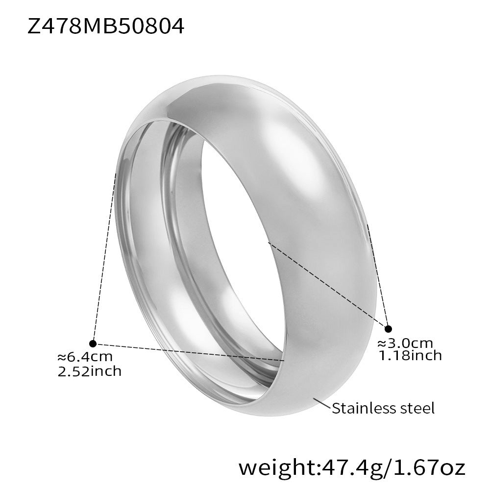 The wide band and polished finish offer a contemporary look, perfect for layering or wearing alone. Lightweight, durable, and tarnish-resistant, this bangle is ideal for those who appreciate subtle, high-quality design with a bold edge.
