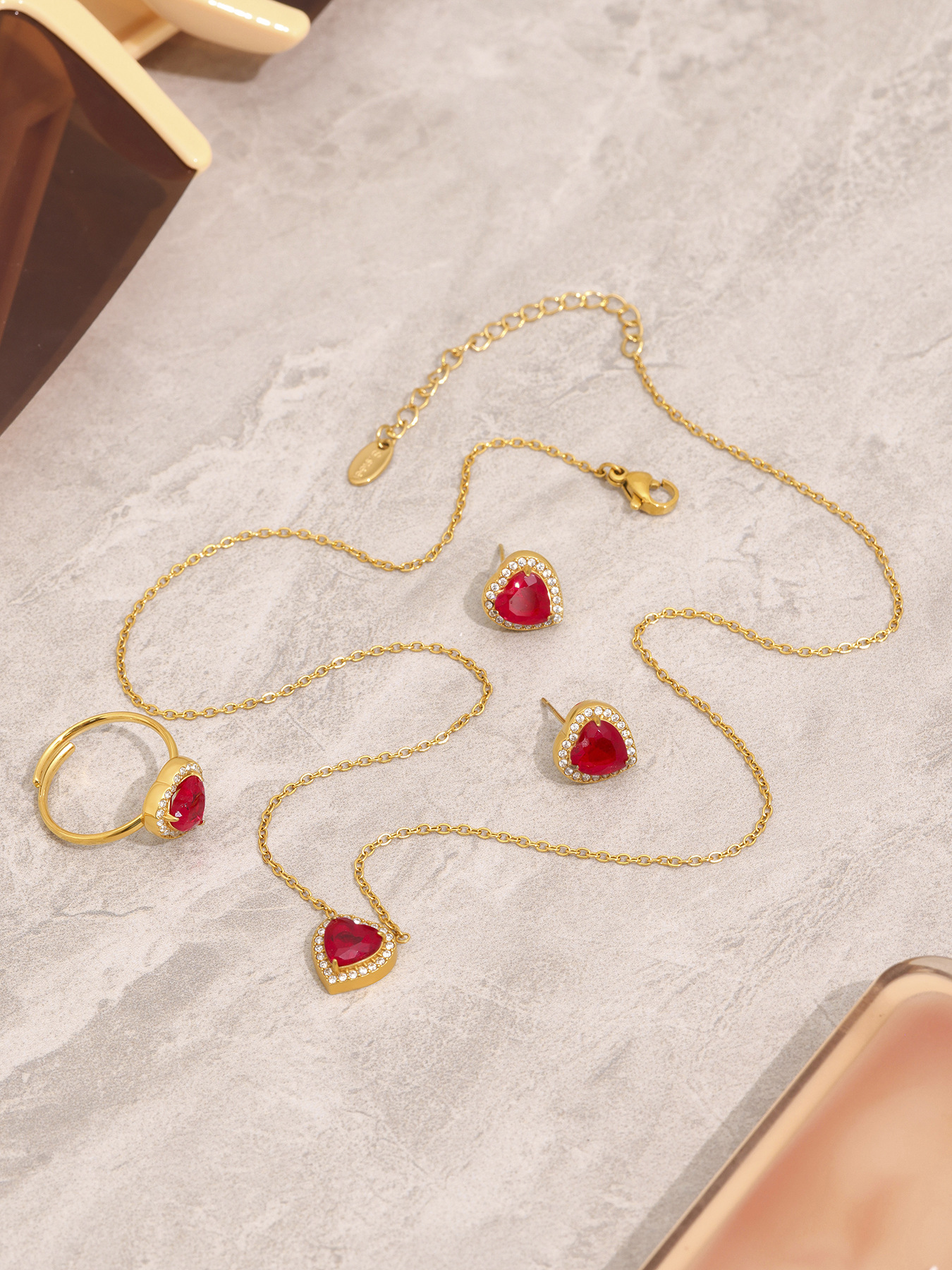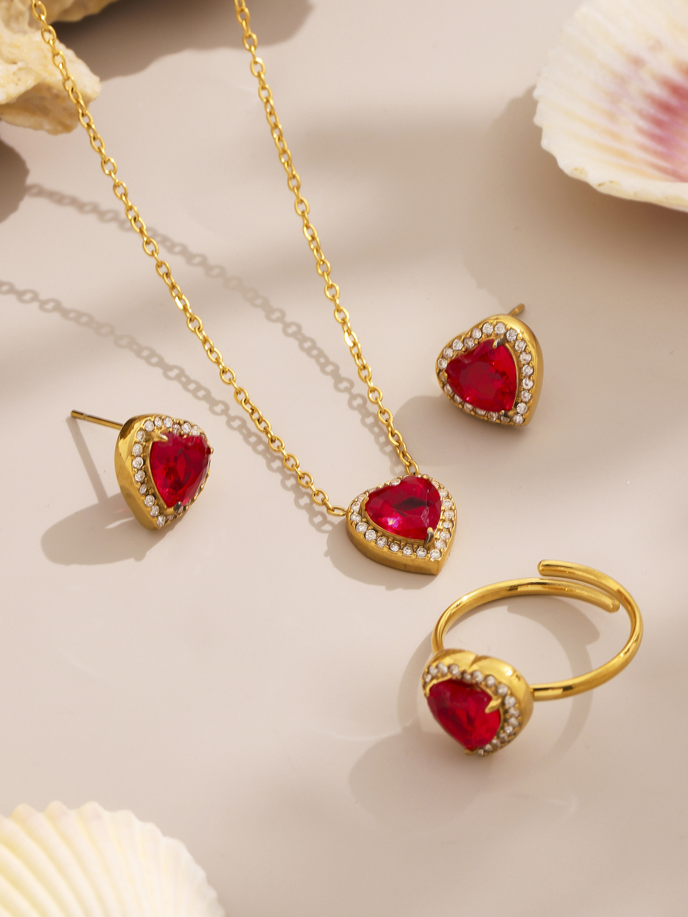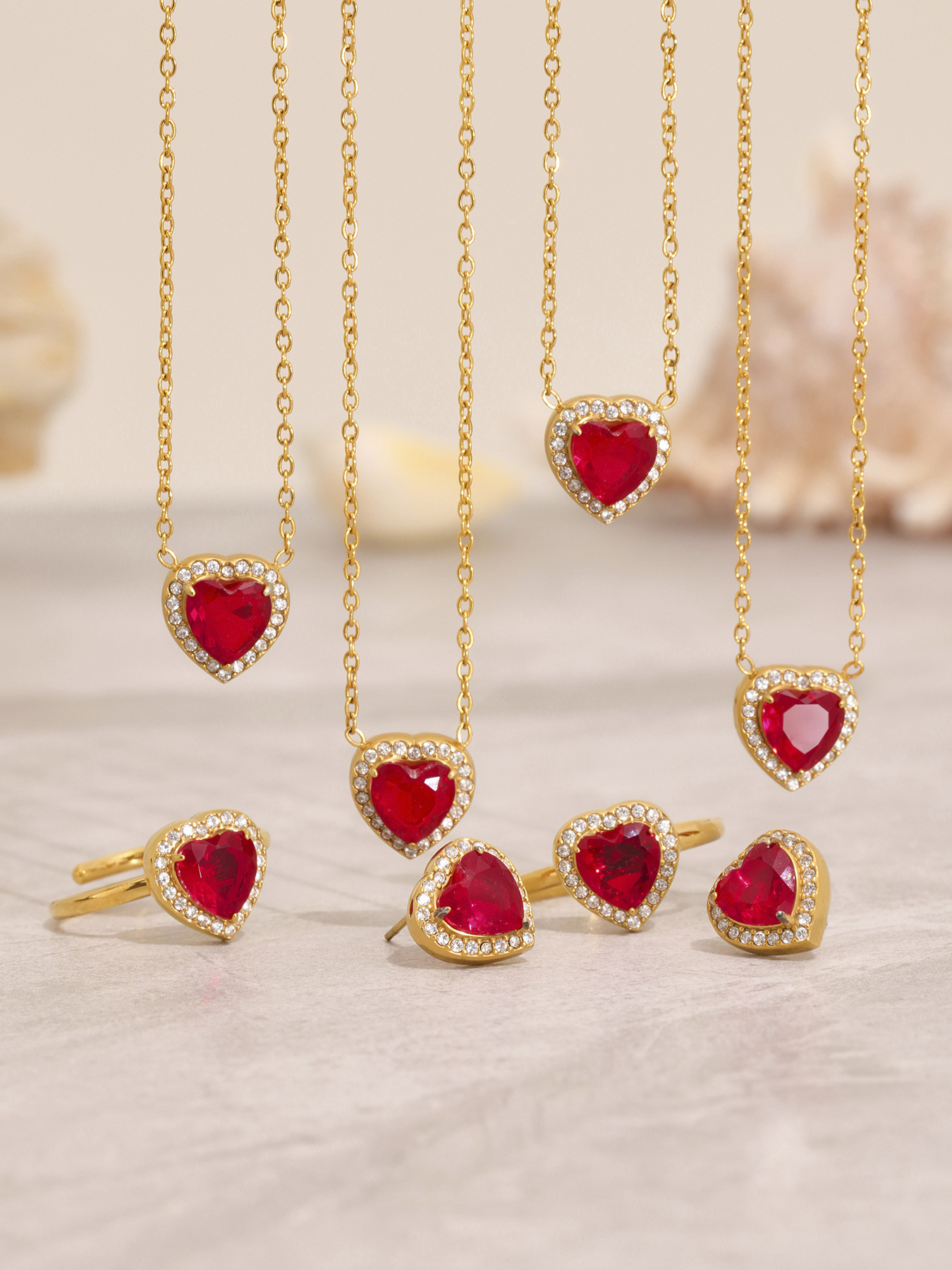 Turn heads with this ultra-sparkling jewelry set featuring a full-crystal “starry” shine and a vivid red zircon heart design. Crafted from high-quality stainless steel with 18K gold plating, it’s durable, tarnish-resistant, and beautifully eye-catching.
