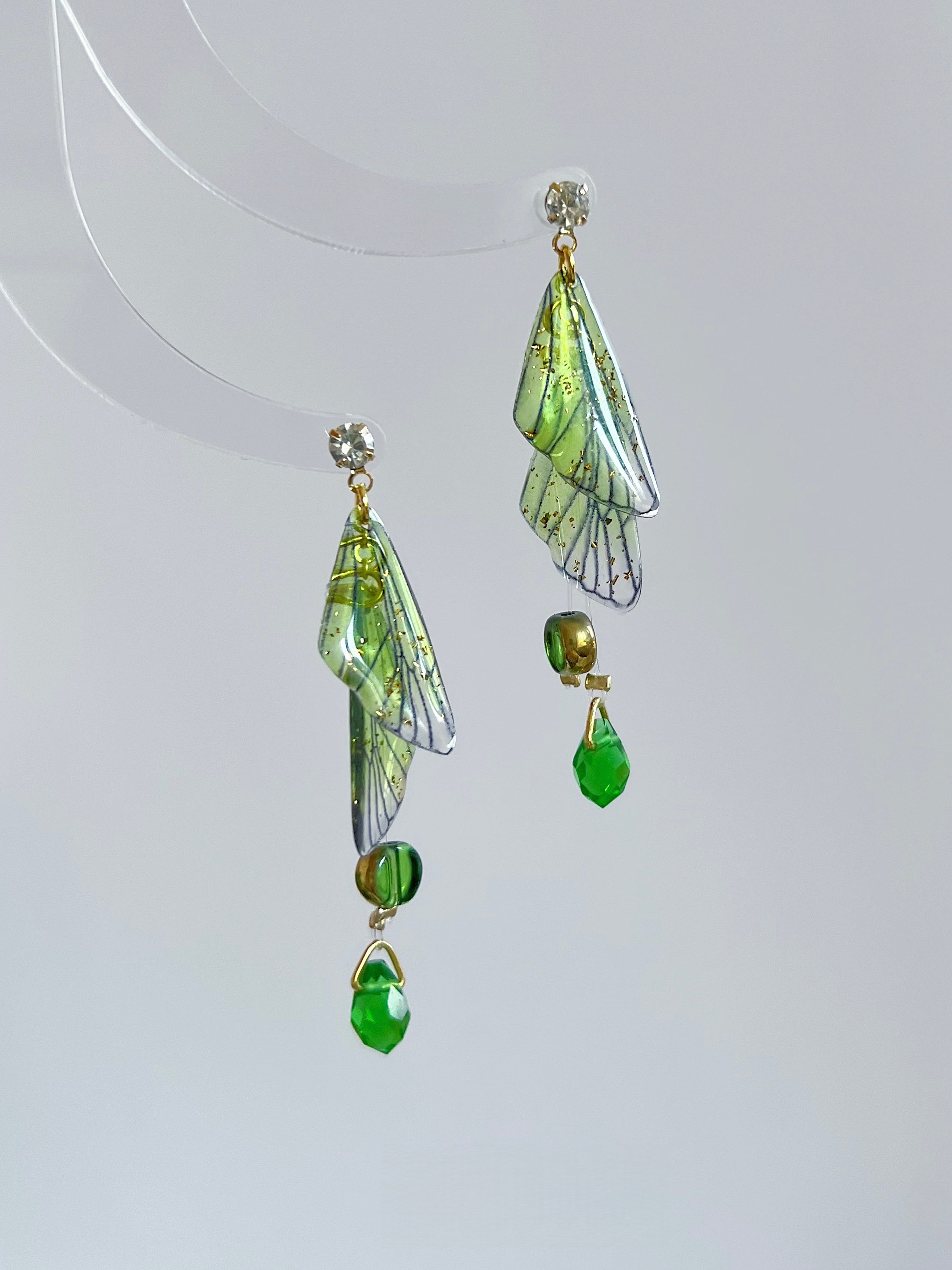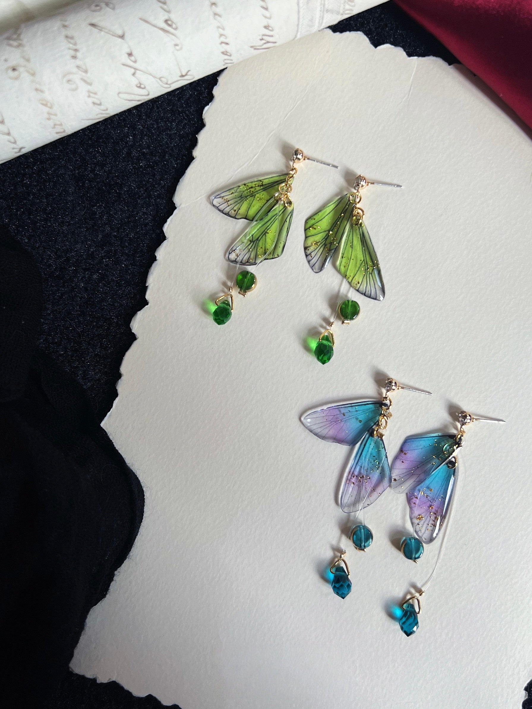 “Robin|Cicada Wing” Original Style Spring-Summer Butterfly Wing Crystal Earrings — Ethereal Forest Long Earrings