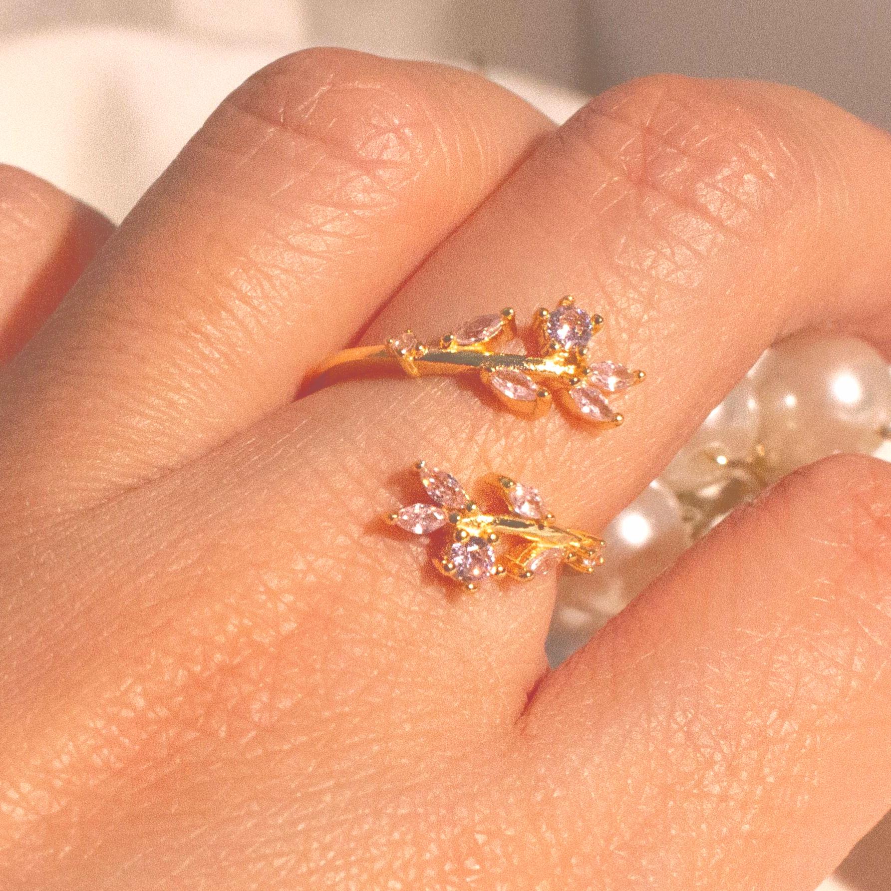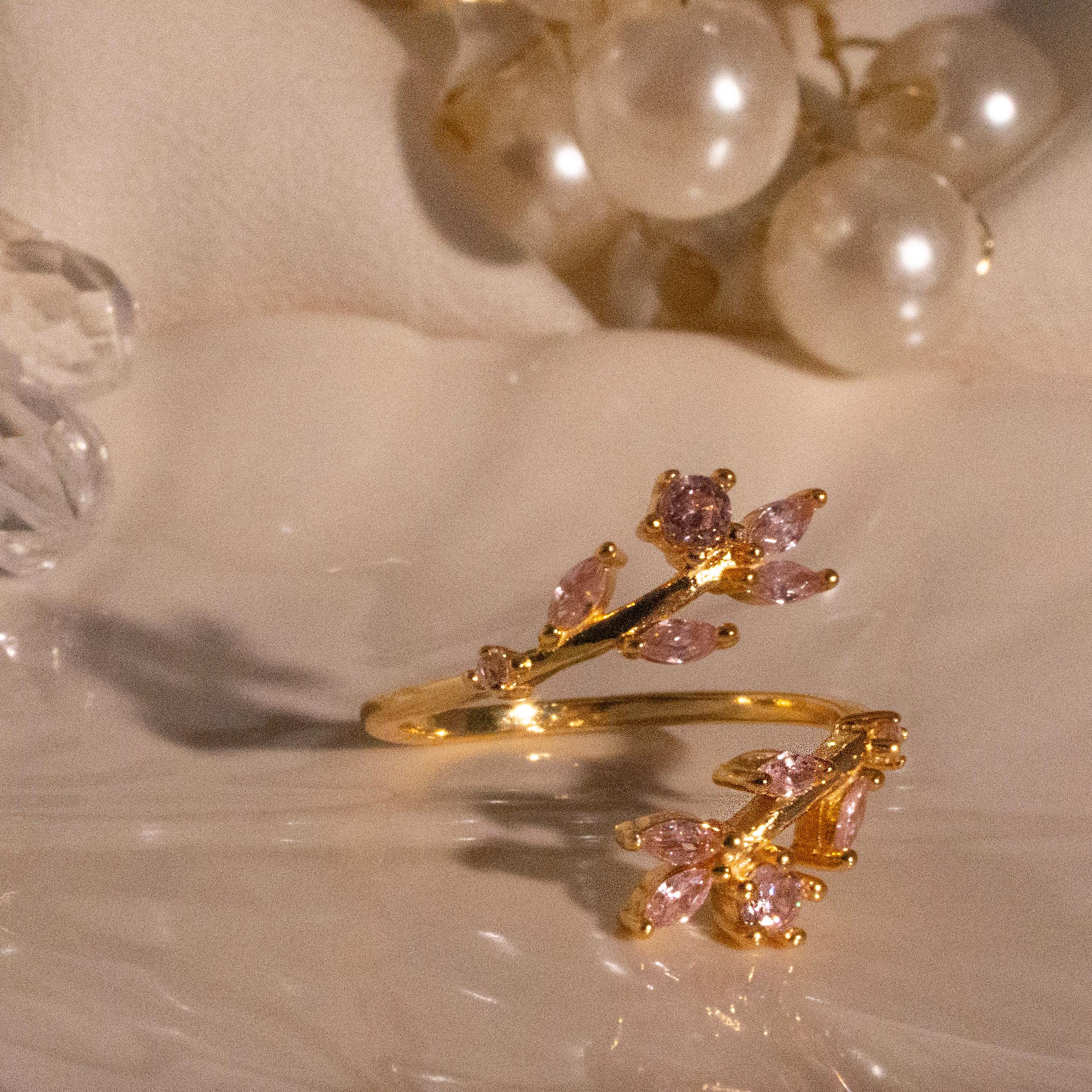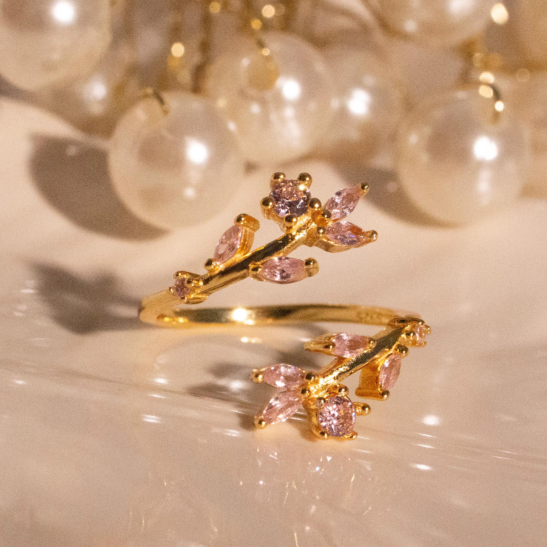 This dainty floral ring features soft rose pink cubic zirconia stones set in a graceful, branch-inspired design. Made from 925 sterling silver with gold plating, it’s a feminine piece perfect for everyday elegance or special occasions.