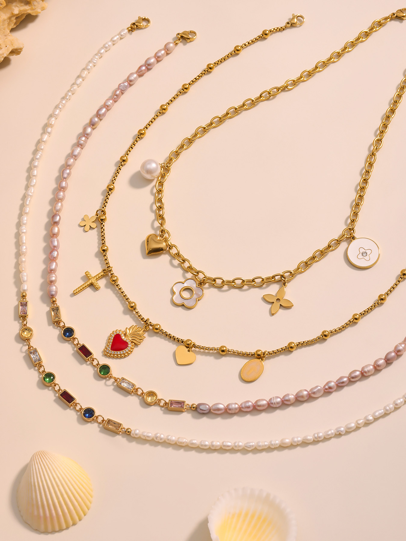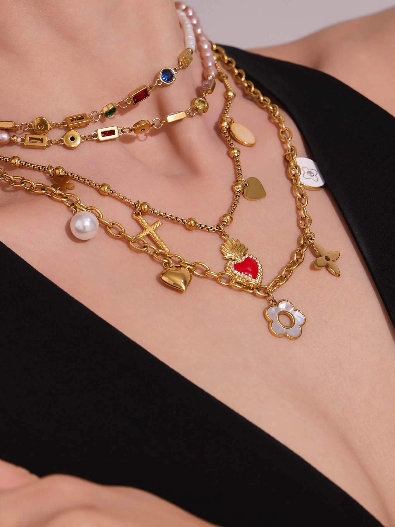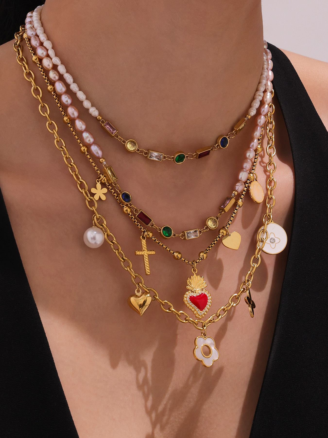 This charming DIY-style necklace features a heart, flower, and cross pendant, embellished with colorful zircon stones. Made from durable stainless steel, it adds a playful and personal touch to your look—perfect for everyday wear or as a thoughtful gift.