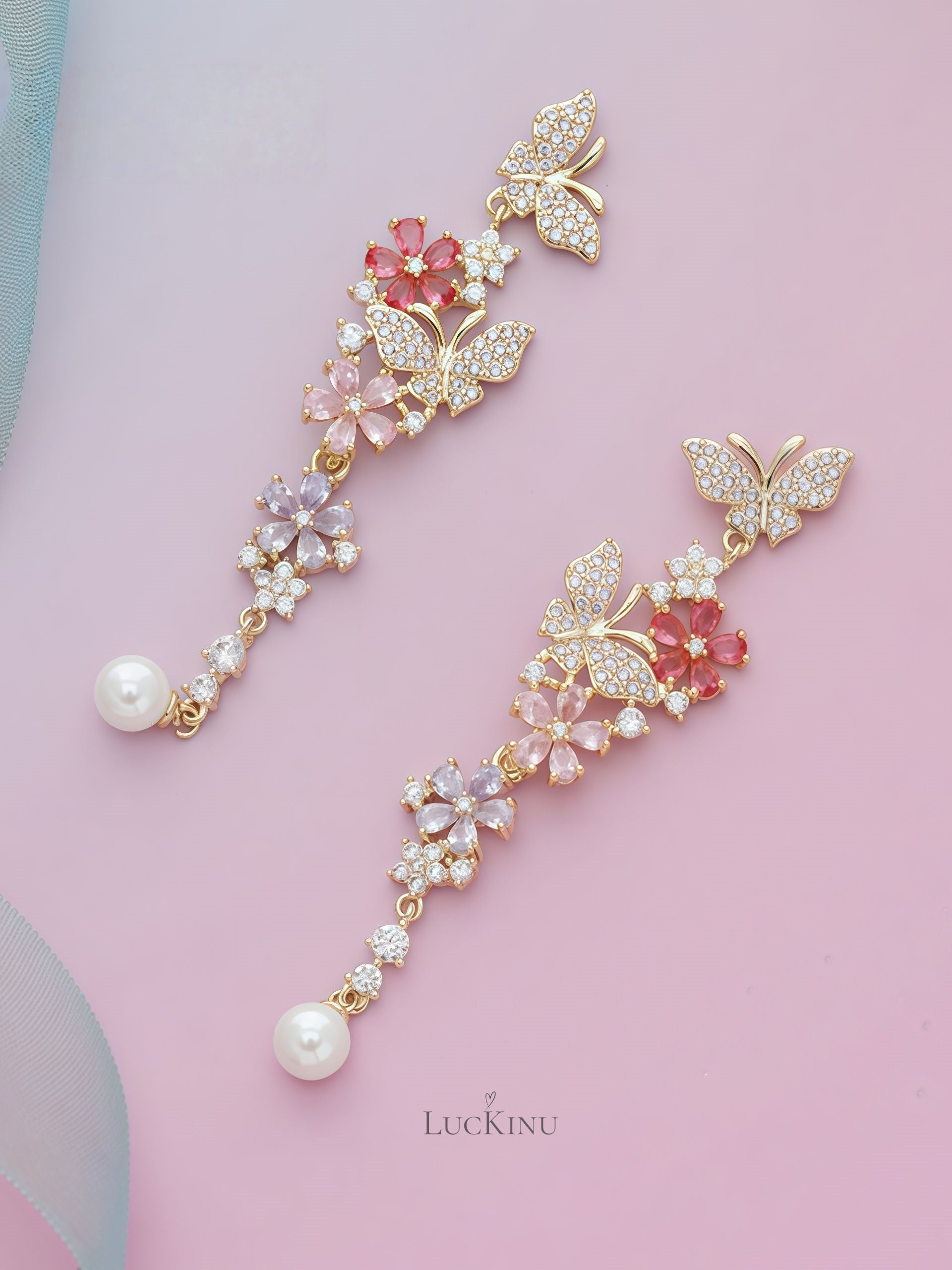 Butterfly & Floral Zircon Pearl Earrings – Detachable Luxury Design