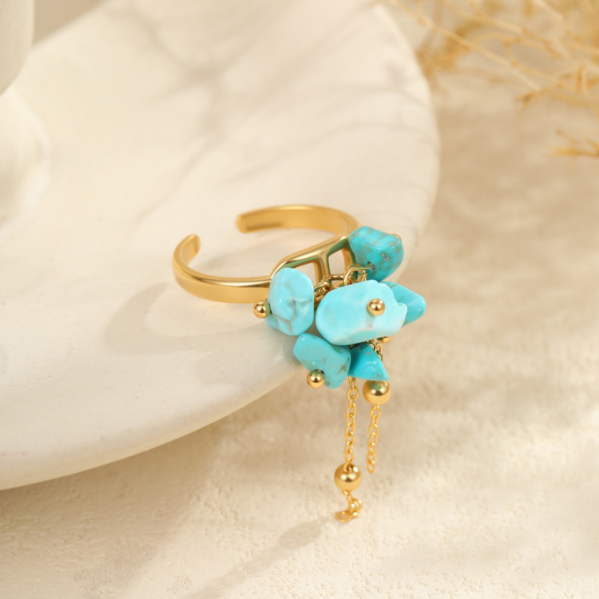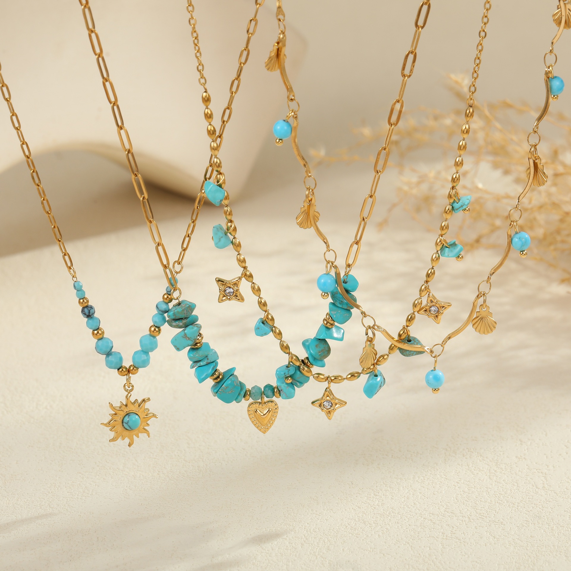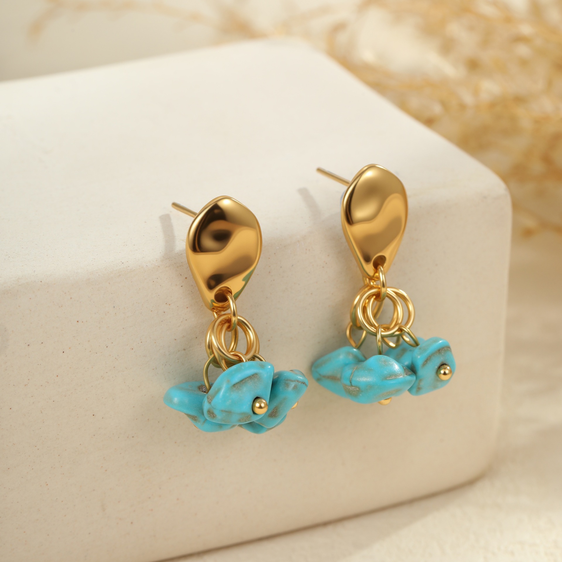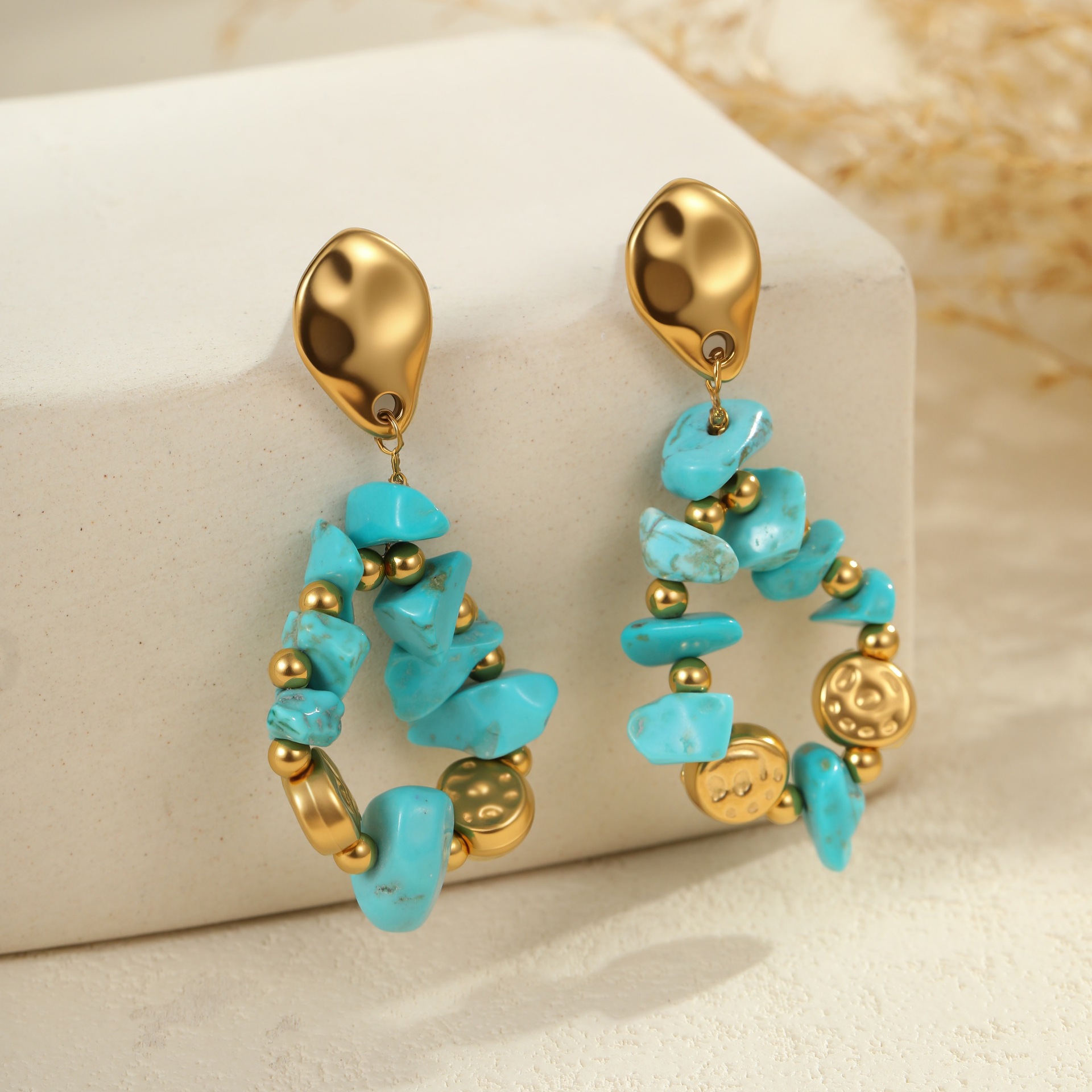 Embrace effortless boho elegance with this turquoise natural stone jewelry set. Featuring a matching necklace, ring, and earrings crafted from premium titanium steel with 18K gold plating, each piece is waterproof, tarnish-free, and designed for lasting beauty. The vibrant turquoise stones bring a fresh, natural touch — perfect for summer styling or everyday wear with a laid-back, chic vibe.