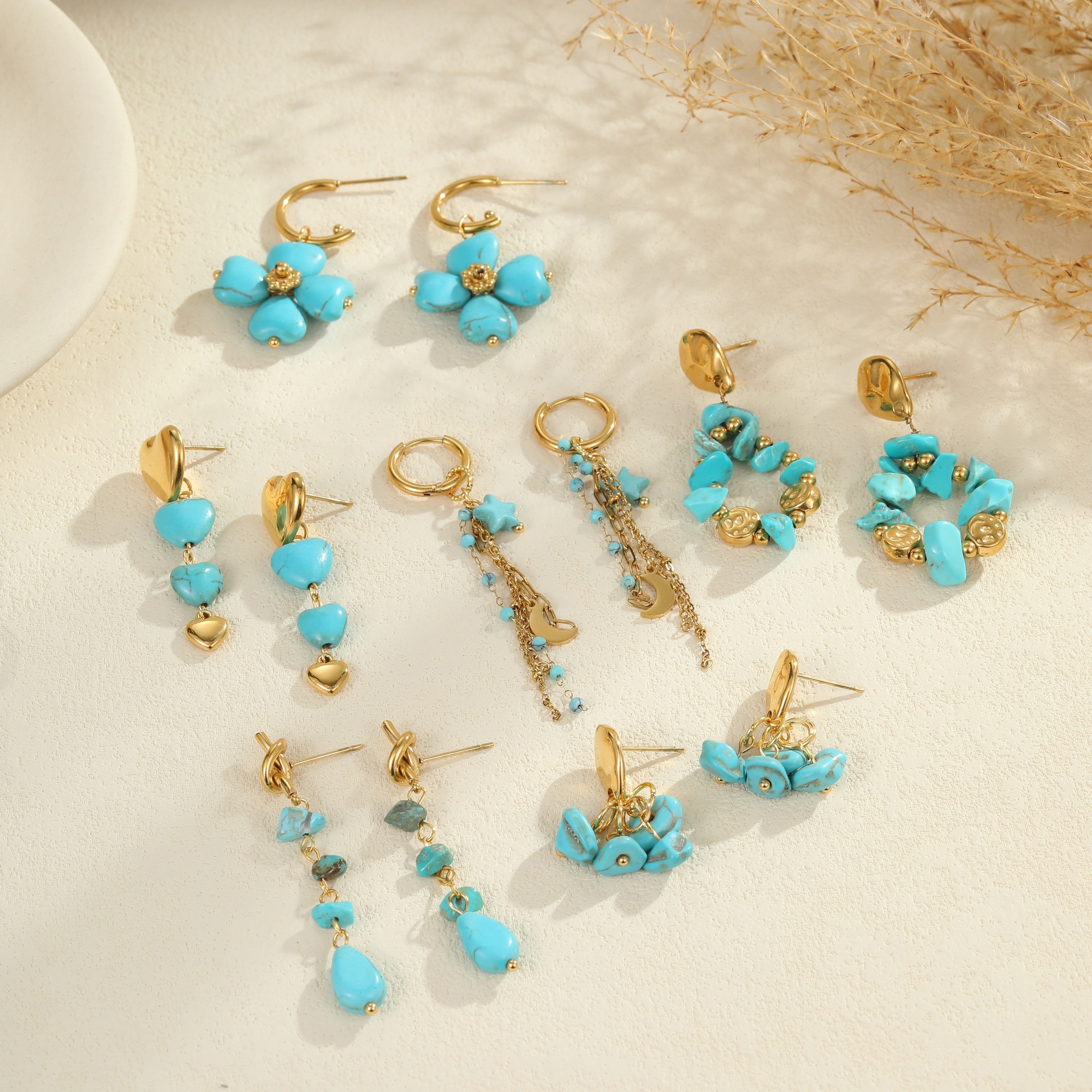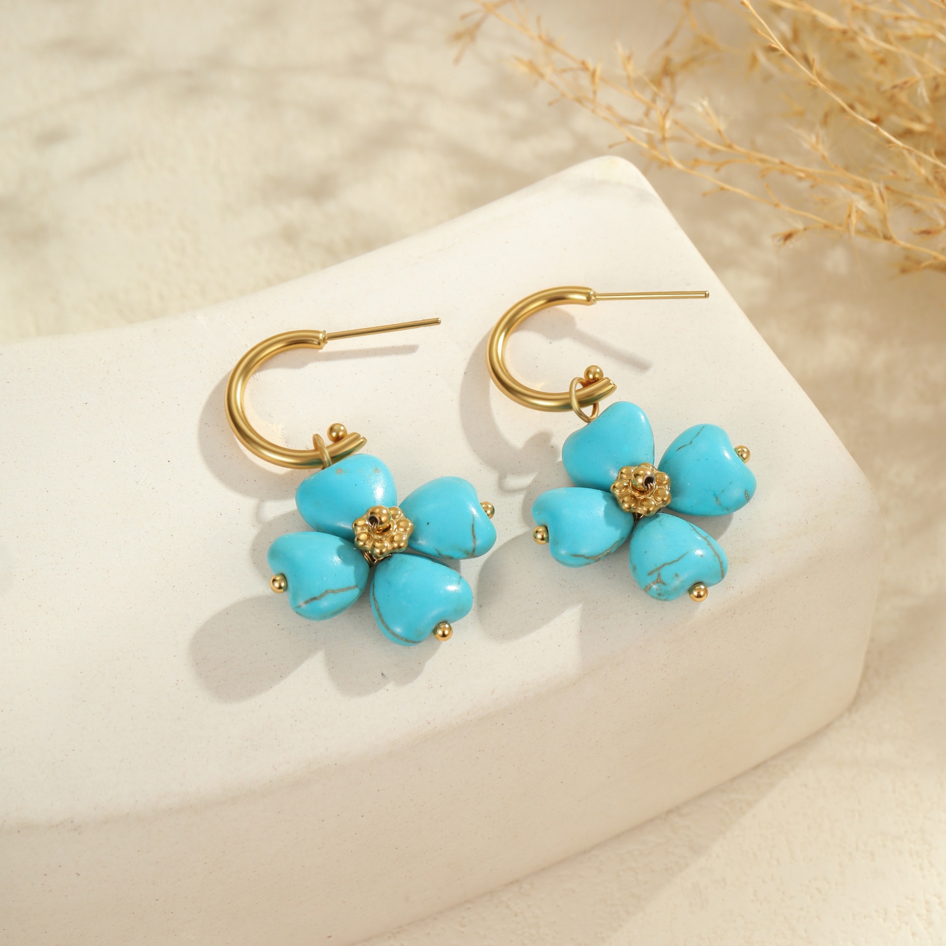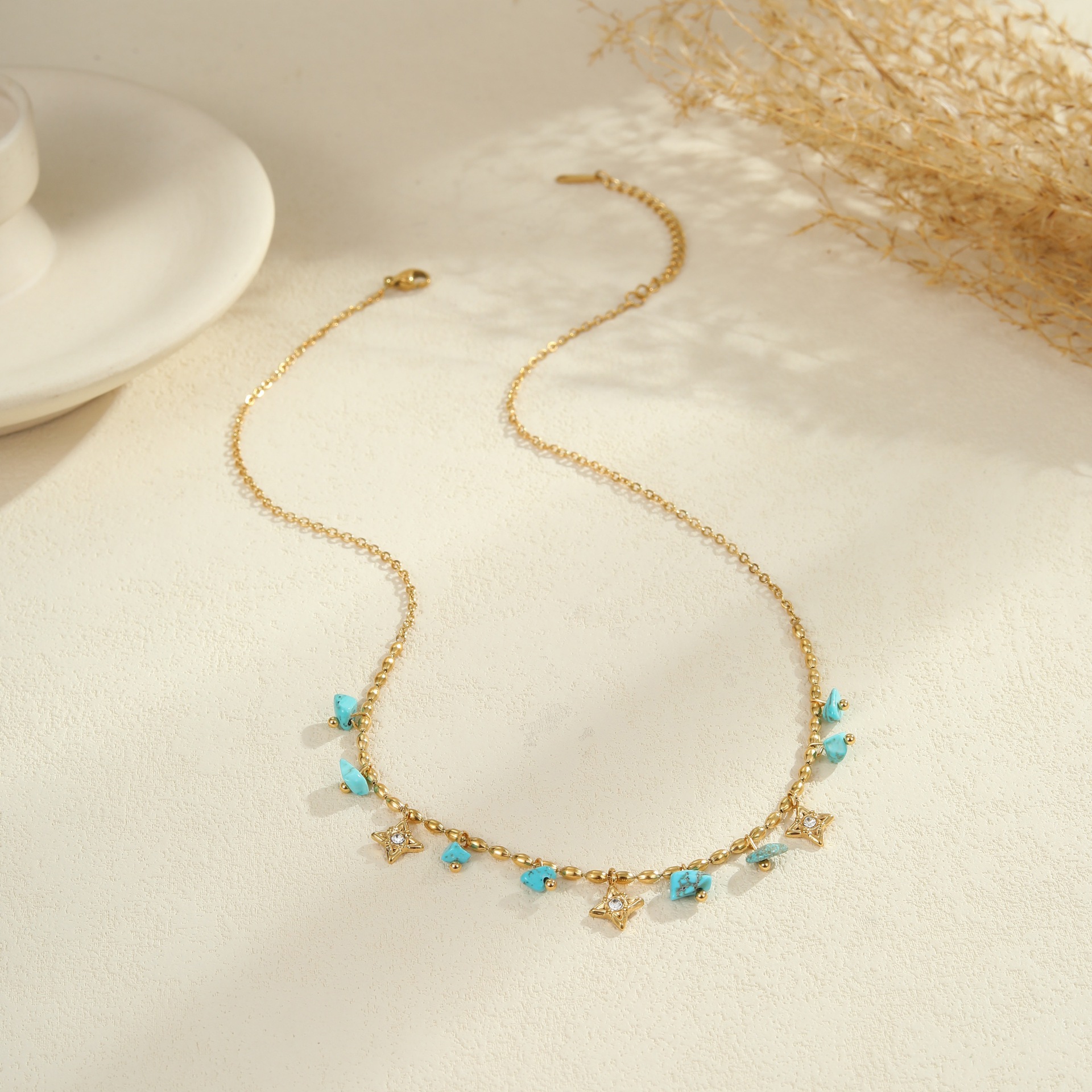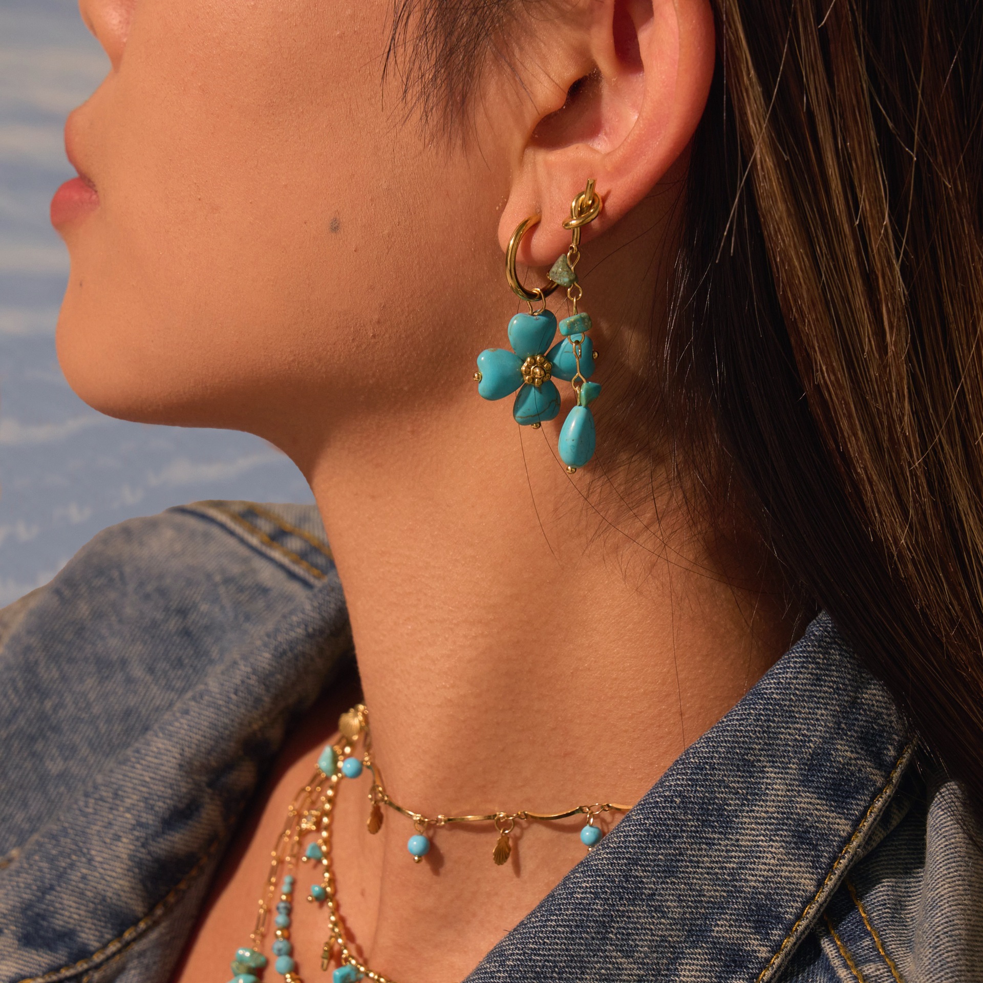 Embrace effortless boho elegance with this turquoise natural stone jewelry set. Featuring a matching necklace, ring, and earrings crafted from premium titanium steel with 18K gold plating, each piece is waterproof, tarnish-free, and designed for lasting beauty. The vibrant turquoise stones bring a fresh, natural touch — perfect for summer styling or everyday wear with a laid-back, chic vibe.