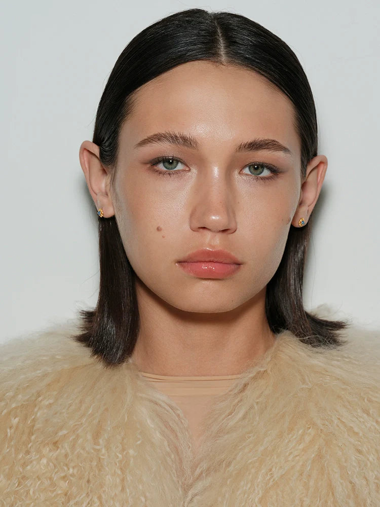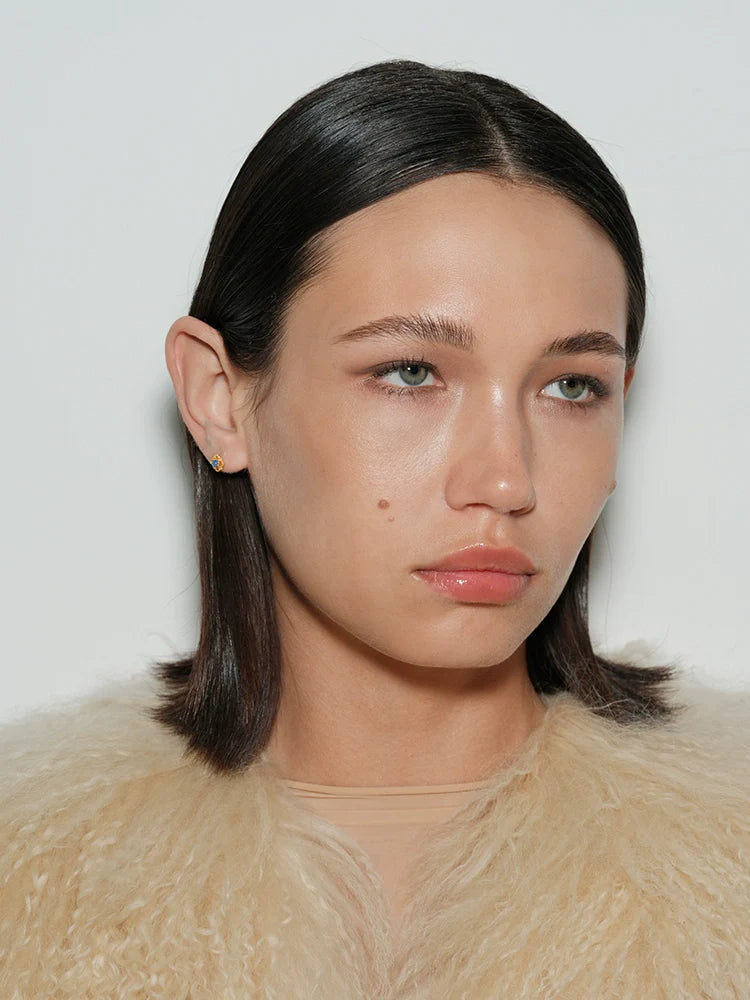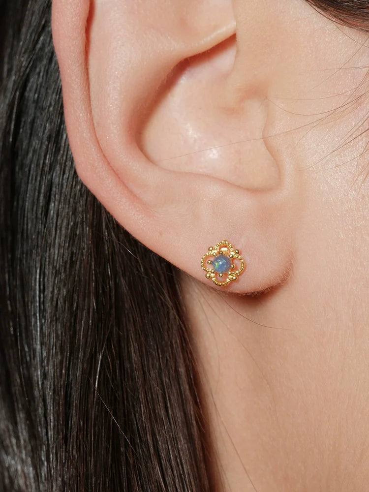 Delicate ultra-mini earrings featuring a blue stone set in a lace flower design with 14K gold-plated bead edges. French-inspired elegance with a subtle, lightweight look perfect for everyday wear or stacking. A charming, feminine gift for birthdays, holidays, or special occasions.