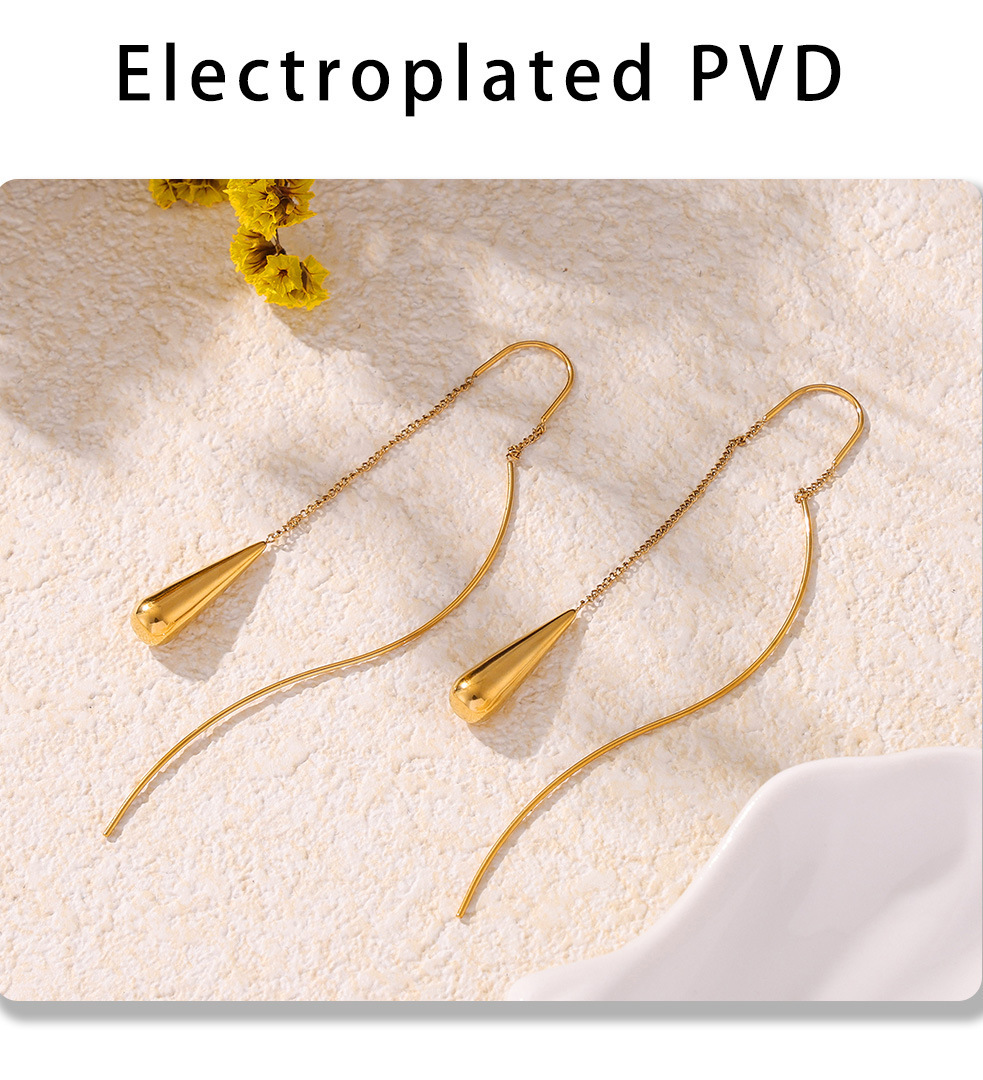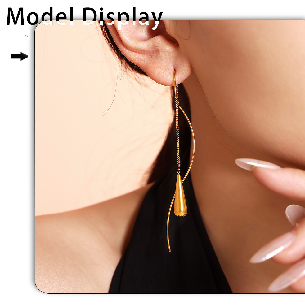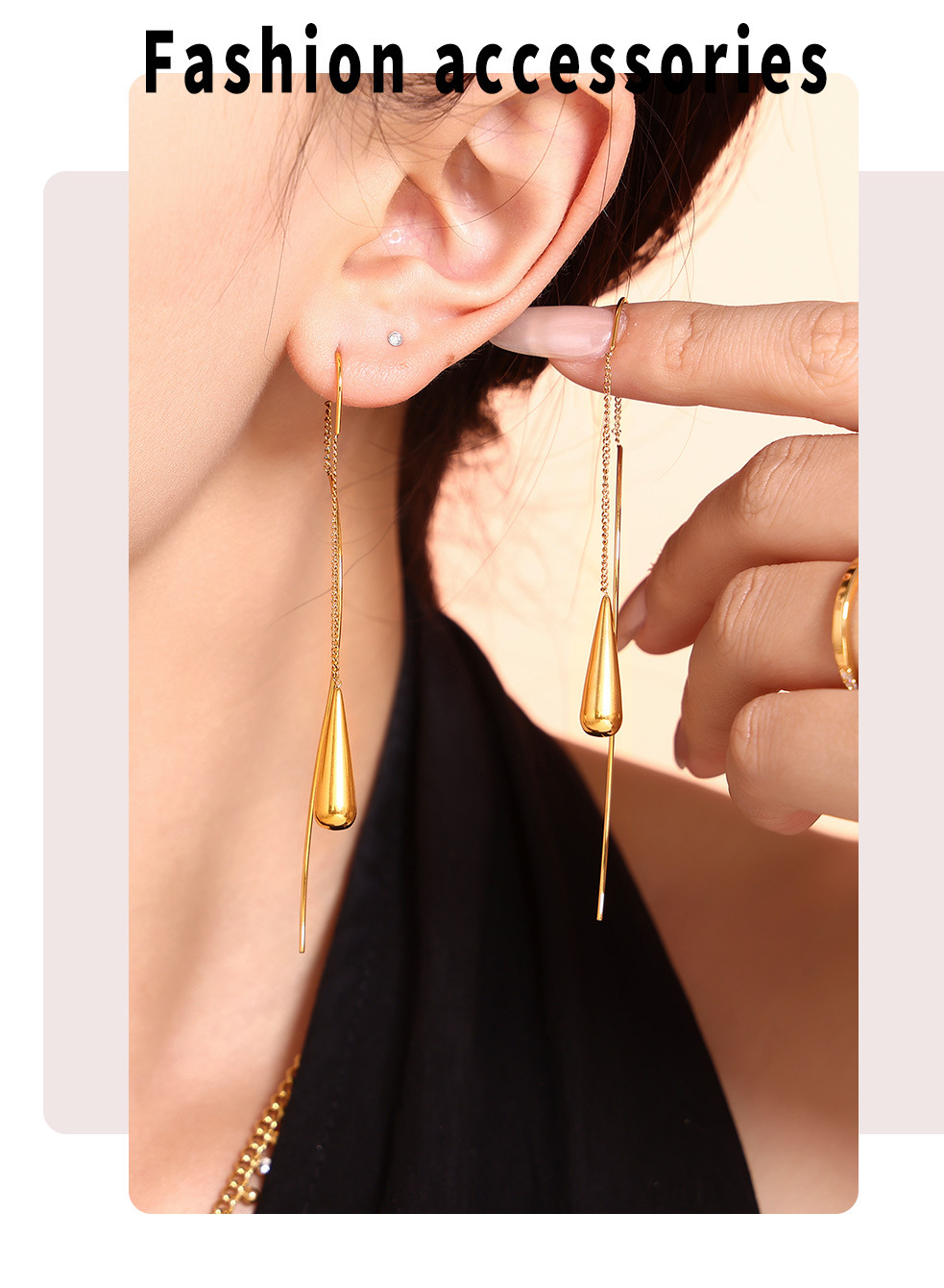 Elegant water-drop tassel earrings crafted from stainless steel for a lightweight, tarnish-resistant shine. Featuring a sleek threader design, these earrings bring a touch of minimalist luxury and small-boutique charm to any look. Perfect for daily wear or a soft, feminine statement.
