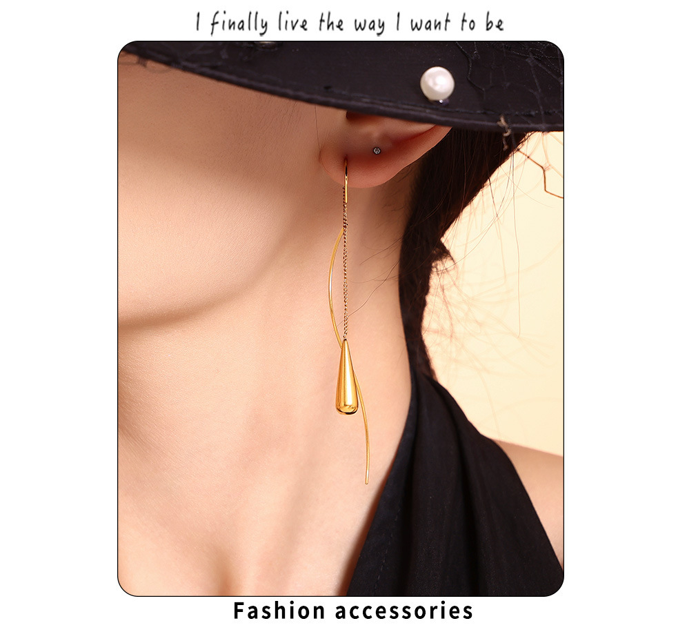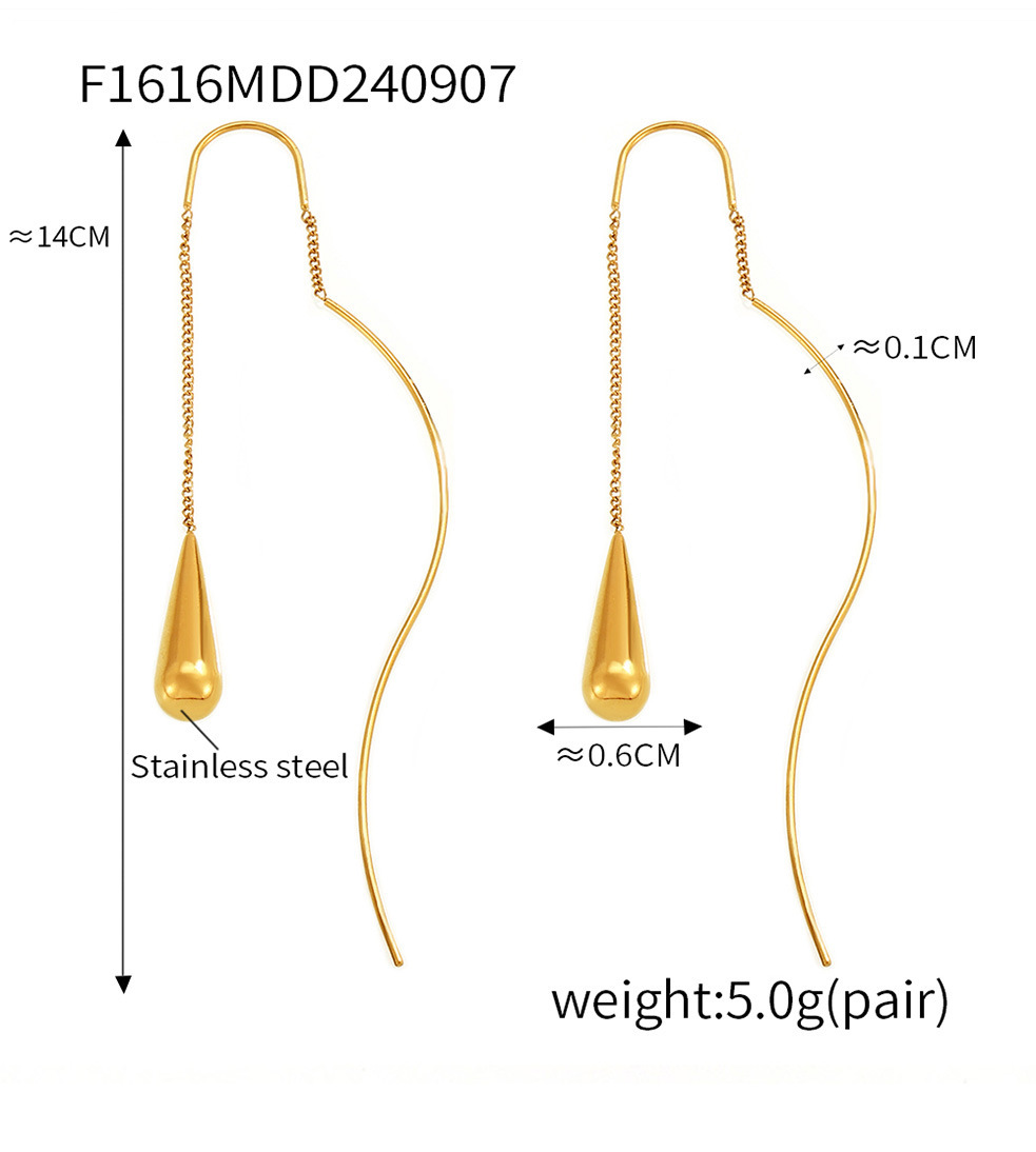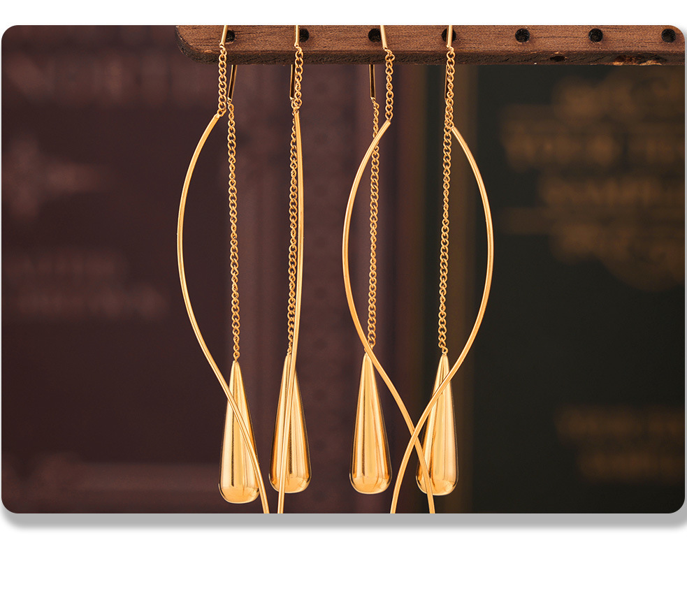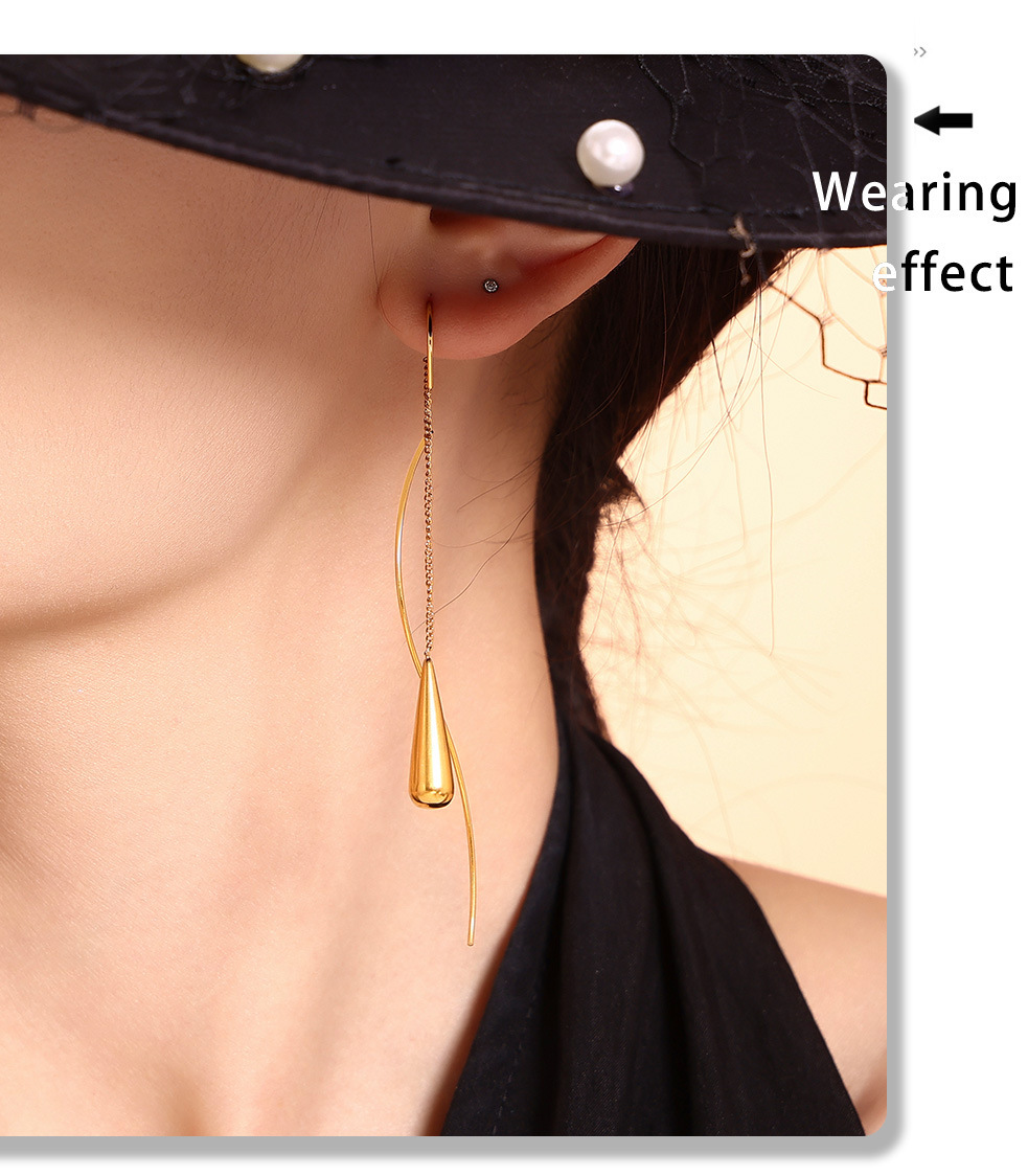 Elegant water-drop tassel earrings crafted from stainless steel for a lightweight, tarnish-resistant shine. Featuring a sleek threader design, these earrings bring a touch of minimalist luxury and small-boutique charm to any look. Perfect for daily wear or a soft, feminine statement.