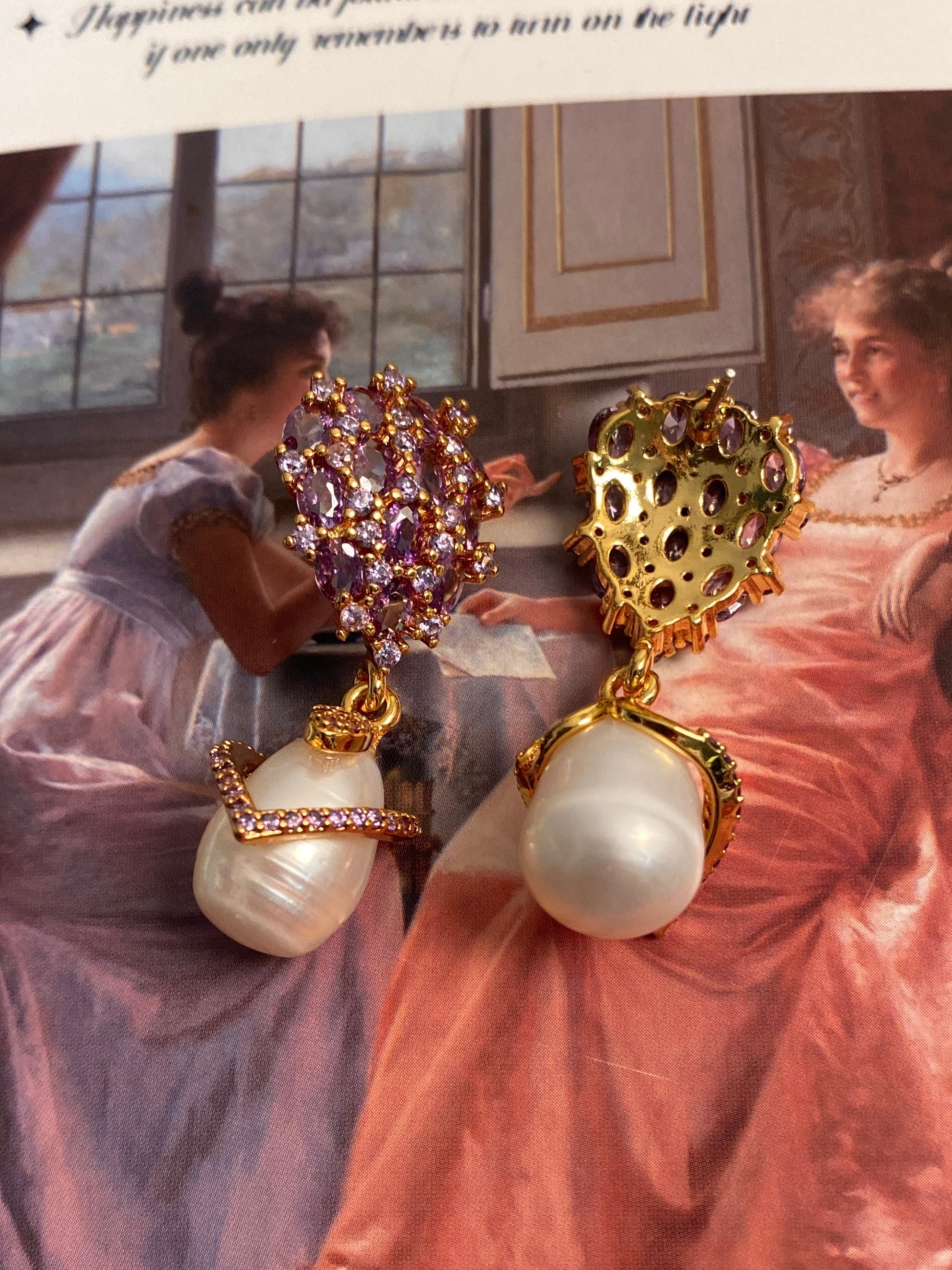 Meet your new obsession. A dazzling cluster of deep lavender crystals delicately "kisses" the top of a single luminous baroque pearl," creating a timeless piece you’ll reach for again and again. Perfect for a special night out or adding a touch of everyday romance.